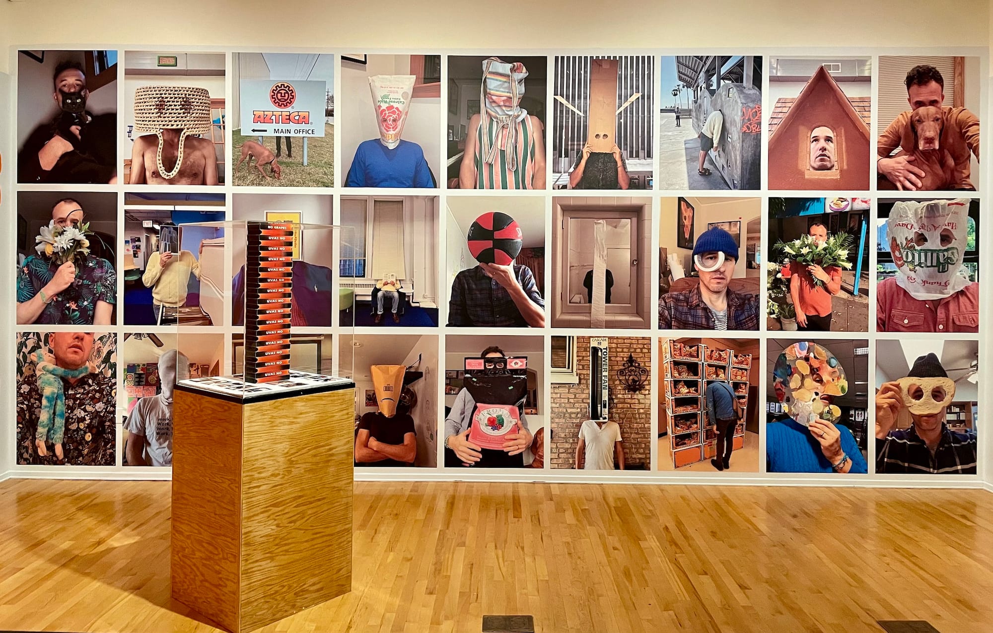 Adjacent is a wall covered in a grid of 27 photographic self-portraits. Not unlike the poster-mask juxtapositions, in each of these Aguilar’s face is cloaked by some situational prop: a black cat, an upside-down basket, a bouquet of flowers, an outdoor sign, an empty rice sack, vertical blinds, a wall at the beach with a head-sized hole. There is no limit to what can become a disguise, it seems — even a slice of white bread can work. Much of this is hilarious, but not all — there’s something a little sad about a man with only a red and black basketball for a face, and people with bags on their heads recall hostage and torture situations. This variety of registers, from the comic to the tragic, feels in keeping with what I take to be the overarching principle of Yo Soy Museo, but also Aguilar’s practice more generally: that just about anything can become something else, given the right approach to materials, situations, and self.