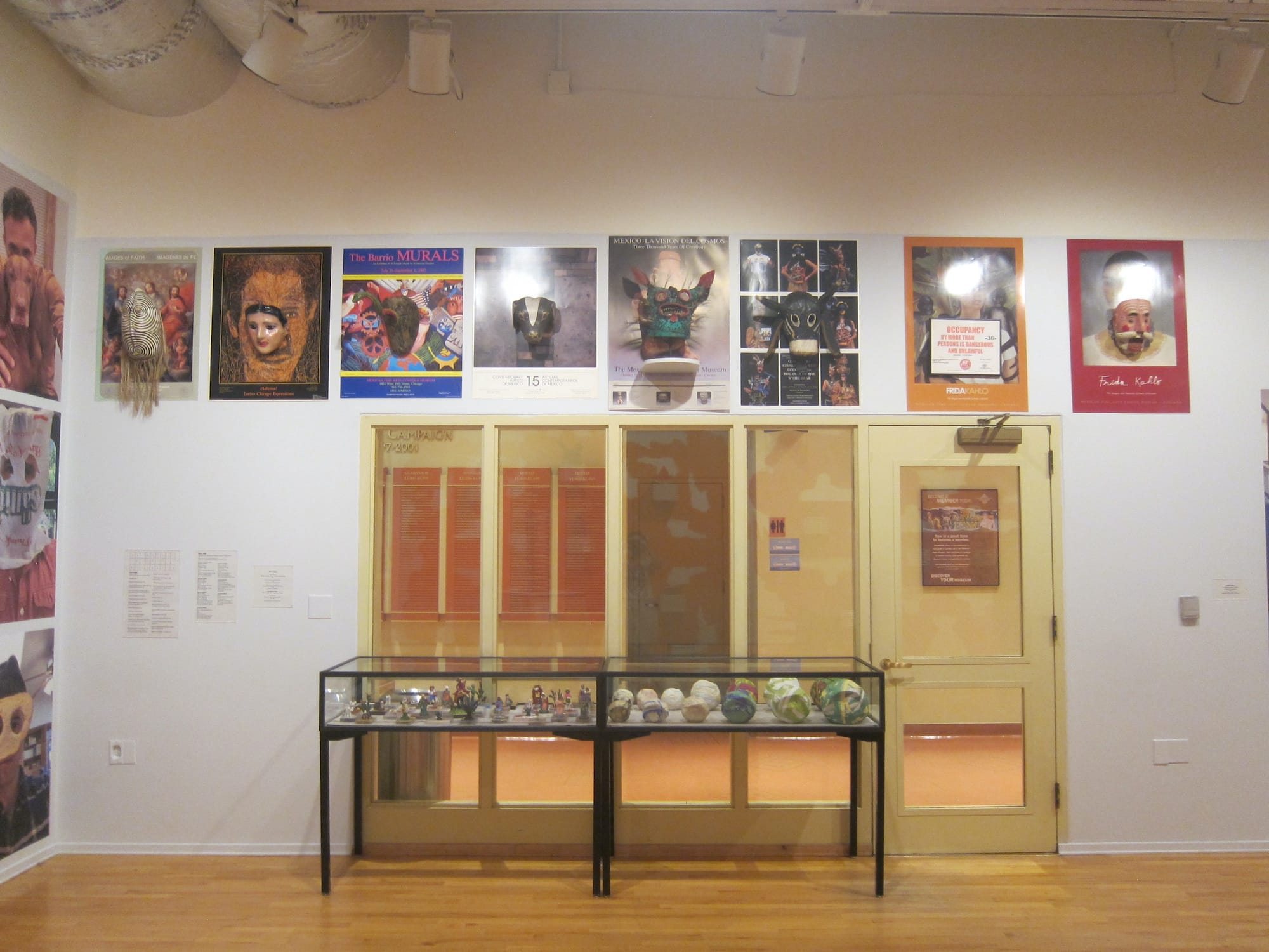 Yo Soy Museo seems at first to belong to the category of artist-curated collections shows. It features a selection of masks from the museum’s holdings, including a dizzying one with straggly vegetable fiber hair, bony protrusions, and a concentric black and white pattern that would make an Op Art painter blush. There are ceramic animals, pottery and glassware, art books, miniature sculptures, abstract wooden reliefs, photographs, wall hangings, posters, and more. The presentation is orderly and well balanced, complete with glass vitrines, plenty of risers and pedestals, lengthy wall labels, and a pair of benches for viewers to sit. So far so good. Indeed, I have no doubt that Aguilar could curate a terrific collections show, except that Yo Soy Museo is no such thing. If it were, only the masks would have made the cut. And they wouldn’t each be hung at the center of an old museum exhibition poster. The resulting superimpositions range from the heretically challenging — that op art mask, by an indigenous Sonoran tribe called the Comáac, partly obscures a 17th-century painting of saints and cherubs from the show Images of Faith — to the aesthetically suave — for instance, a carved wood dog mask, whose neutral tones and markings match those of the abstraction used on a poster for an exhibit of contemporary Mexican art.