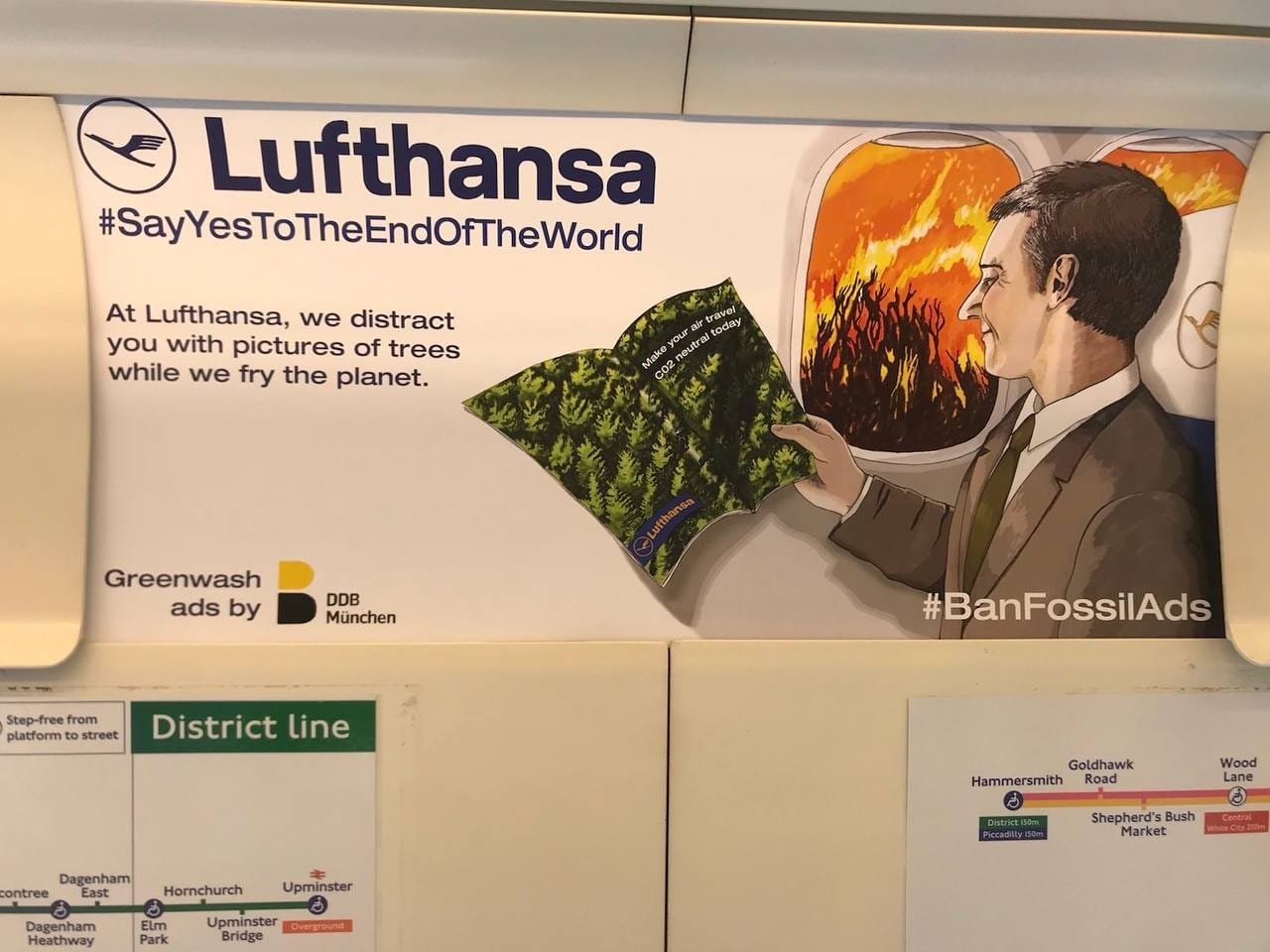 At first glance, the posters may resemble typical airline ads. But a closer look reveals cheeky phrases such as "Create a Less Sustainable Future" in a faux-billboard for KLM and "Low Fares to Plastic island" in one for "Ruinair," a play on the airline Ryanair. One fake ad for Lufthansa depicted an airplane passenger reading a pamphlet illustrated with trees while a fire burns outside the plane window. The hashtag "#SayYesToTheEndOfTheWorld" is followed by the text, "At Lufthansa, we distract you with pictures of trees while we fry the planet."