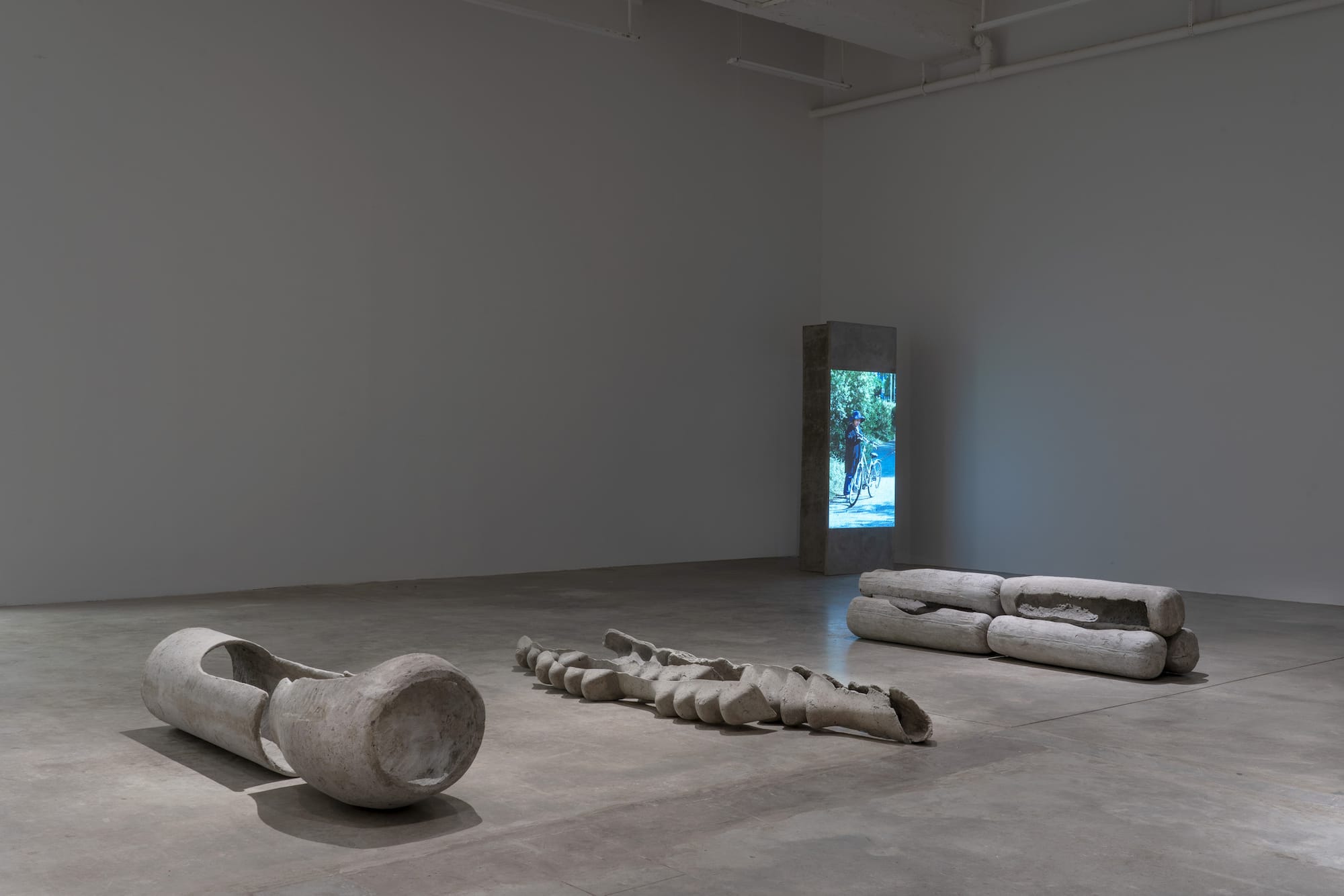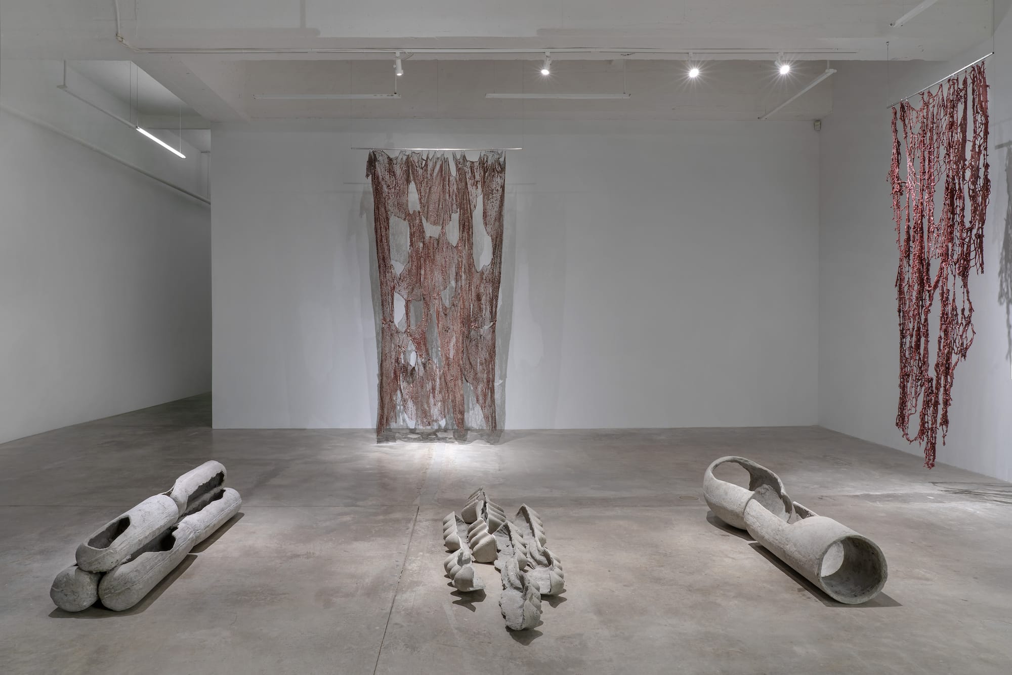The first gallery contains hollow concrete objects that resemble elongated pods with an opening or a cluster of spine or hollow rib-like forms, a short video of a woman, first outside with her bicycle and later puttering in the kitchen, and three distressed nettings hanging from metal rods. None of these prepared me for what was in the second gallery, even though I knew there would be a machine, dripping liquids, and entrail-like forms from seeing reproductions and short clips of Lee’s kinetic work. I suspected that the woman in the video — who happens to be the artist’s mother — is central to the entire exhibition, but in no obvious way. The open forms, or concrete shells, and the nettings fall under the definition of “carrier,” as a means of carrying something, but that still does not explain the feelings that surfaced as I engaged with the installation in the second gallery.