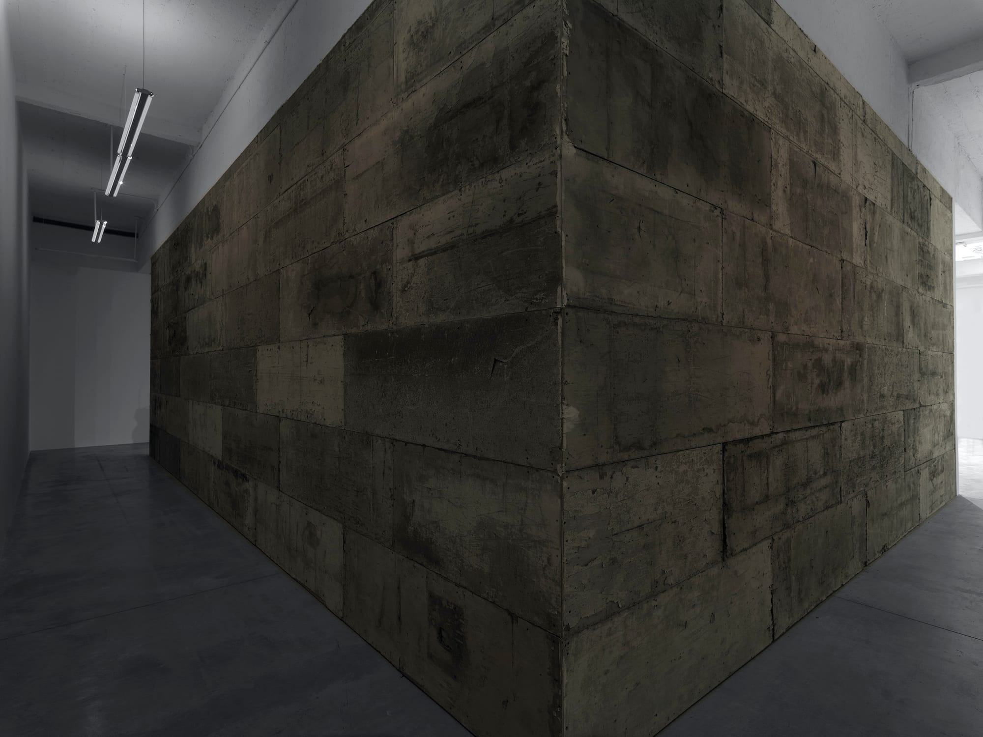 After walking through a dark corridor, between two walls, one of which was made from weathered plywood panels, I turned a corner and entered a large, dark, windowless room, its stained, plywood-paneled walls smelling of machine oil. A large, hollow, dark brown metal platform, set at a diagonal and covered with black metal grating, takes up most of the space. Three moving, dripping, slime-covered, knotted, tentacular forms hang above the platform, suspended by wires from the ceiling. Smooth transparent tubes connected to a pump in one corner of the platform dangle from them. The pump pushes a clear, oily liquid and air pockets into the rubbery, twitching tentacles, which bleed out of them, dripping into the box. The continuous cycle is punctuated by a sound that recalls something between a machine and a slowed-down heartbeat. I sat on the concrete bench in one corner. No one else who came into the space joined me.