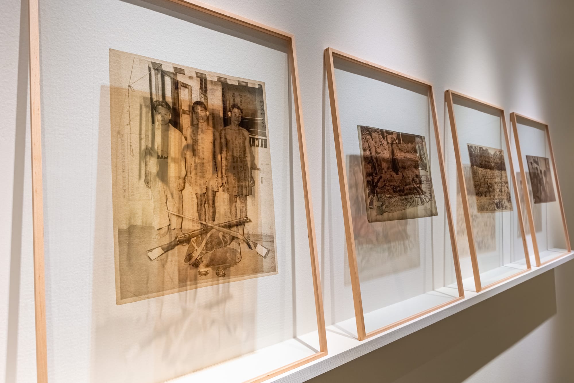 This multiplicity of viewpoints sets the stage and tone for the project’s Interventions (2018–21) series, 12 foil prints on glass plates hung along one wall of the museum, picturing soldiers parachuting into the jungle, a burning house, or captured insurgents with their weapons piled at their feet. The images were sourced from the collection of the Imperial War Museum in London and originally used as British wartime propaganda. By presenting them in a semi-transparent way that allows the viewer to see through the images to the labeling notes on their reverse side, Sim prompts consideration of dualities and shows how constructed such images really are.