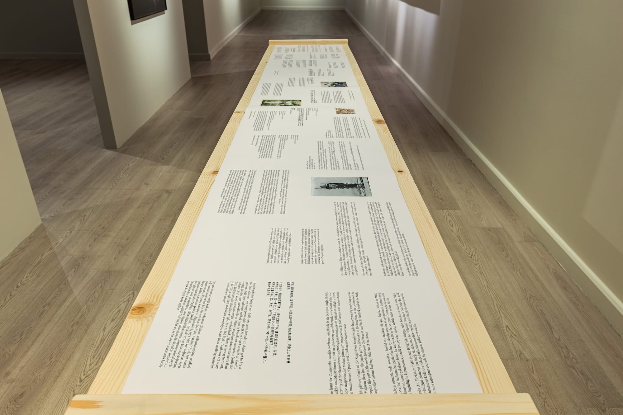 The biennial presentation of Sim’s multi-part project, 'One Day We’ll Understand', opens with a strip of paper printed with mostly fragmentary and unattributed texts, laid out on a long table at Istanbul’s Pera Museum. The viewer is left to sort out which texts might belong to news reports from the conflict, accounts of the fighting by British soldiers, or the oral histories Sim has collected from her grandfather’s leftist contemporaries.