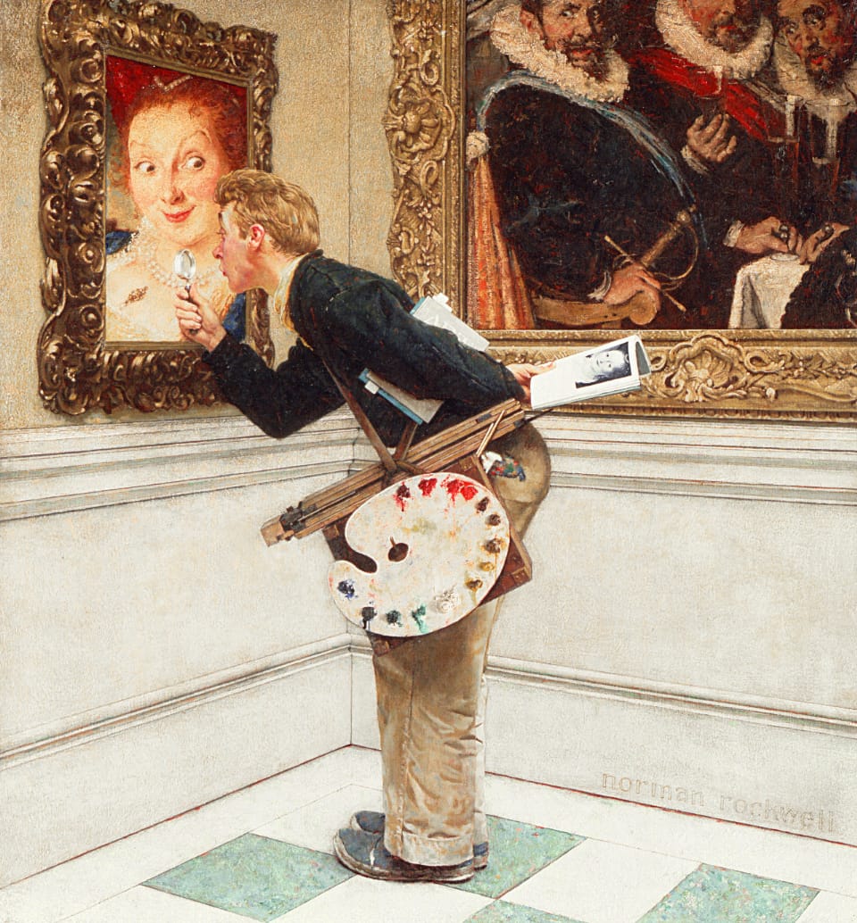Despite ongoing project deadlines, Rockwell remained a methodical craftsman. Each finished piece could take as many as 15 steps and countless sketches to complete, and his preparatory drawings are often so impressively executed that they could easily be finished works, though they were never shown publicly. The book explains that Rockwell’s fastidiousness owes itself at least in part to his love of the Old Master, and he referenced and sometimes imitated Raphael, Leonardo, Dürer, Vermeer, and others in his work. For example, Rockwell’s “Rosie the Riveter” (1943) takes the same pose as Michelangelo’s “Prophet Isaiah” (c. 1511) from the Sistine Chapel, and in “The Art Critic” (1955), his son poses as a young gallery-goer admiring a Rubens-esque portrait, modeled by the artist’s wife.