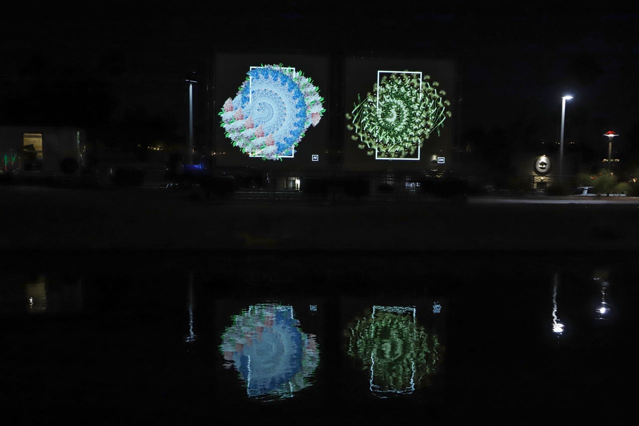 Some standouts include Calgary’s B!G ART collective — Paul Magnuson, Matthew Waddell, and Devin Giles — who first showed their work the DOOR(S) in Scottsdale in 2021. The playful work comprises a standard-looking front door, which upon opening reveals a full-length video screen that pictures other locations, environments, and figures. This year the collective boasts three installations including a reprise of the DOOR(S), installed on the canal and in the nearby Scottsdale Fashion Square shopping center. The two works will look at each other, equipped with cameras that allow viewers to see what is happening in each location. B!G ART’s other works “the TUNNEL” and “the STARQUARIUM” also offer up notions of otherworldliness, portals, and transport.