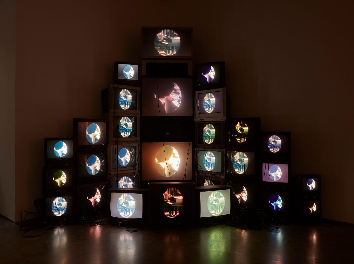 Mercifully, a sequence of narrative-driven works lends shape to an exhibition that has the potential to transcend its branding. A downtempo Nina Simone sets the tone, playing piano and crooning across 29 television screens in a pyramidal installation by Atlanta-based artist Paul Stephen Benjamin. The work is titled “Black is the Color” (2015) which is the lyric that echoes through it as three clips of Simone endlessly cycle. The singer’s drawn-out vocal steeps like tea, slowly resolving to the ear.