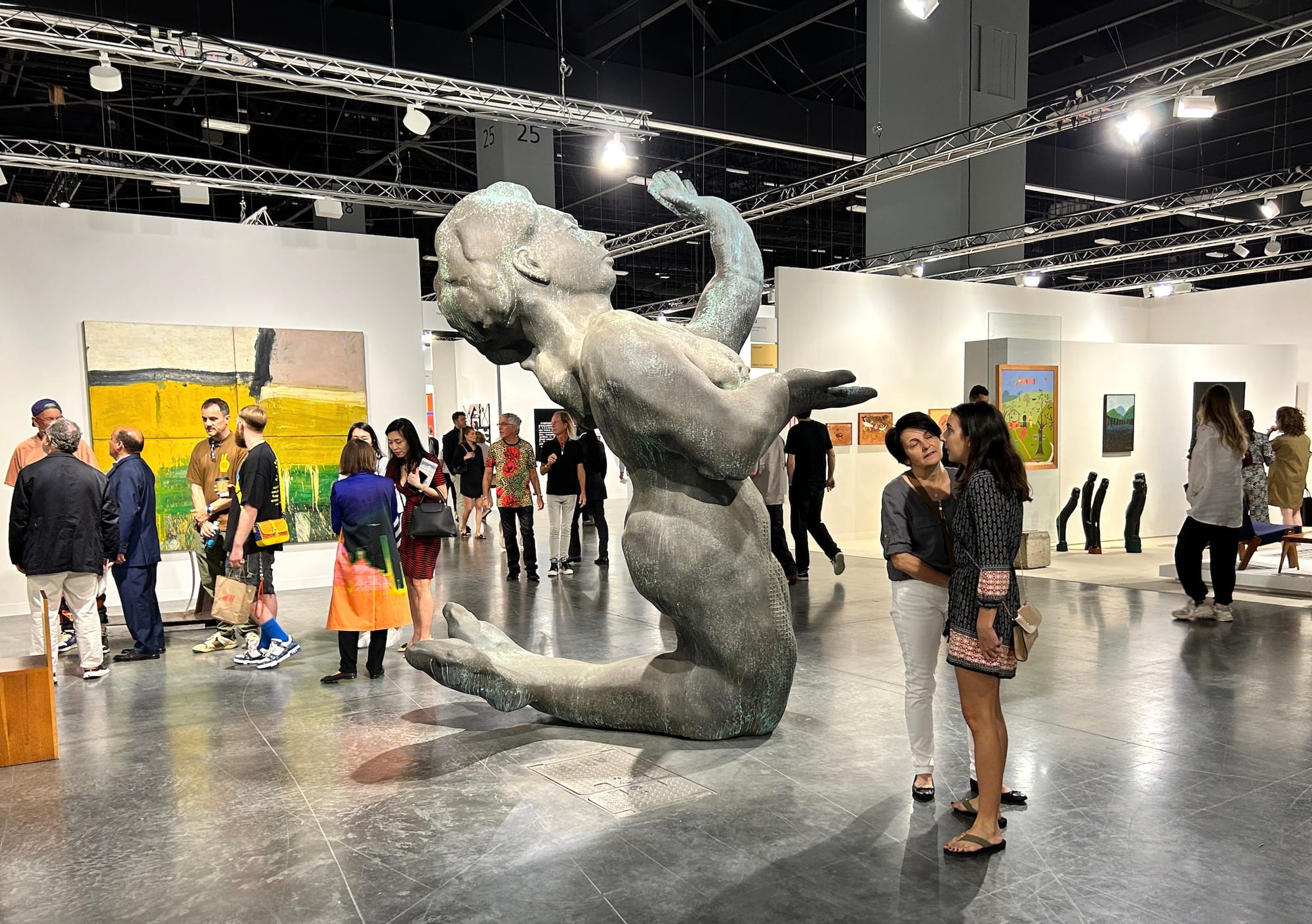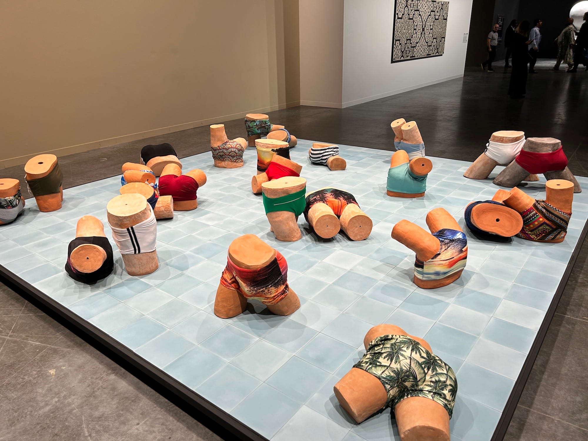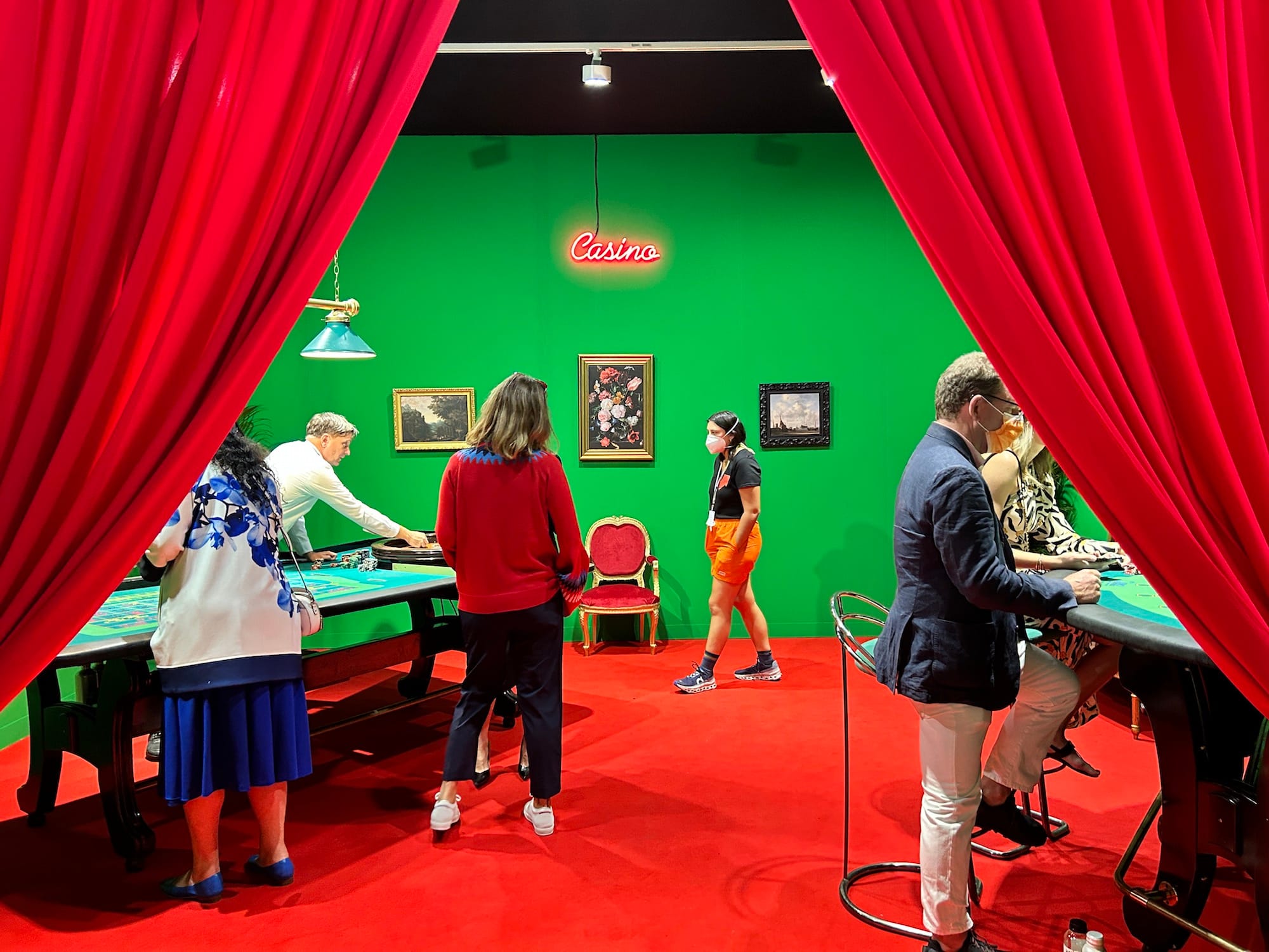 Barbara Ess's dark and haunting photographs at the booth of the New York gallery Magenta Plains provided a welcome respite from all the obvious, trying-too-hard gallery displays. I chuckled at Jonathas de Andrade's "Lost and Found [Achados e Perdidos] (2020–2022), a sculptural grouping of 25 clay butts wearing tight, multi-patterned swimming shorts inspired by the forgotten bathing suits left behind in the changing rooms of Recife's swim clubs in Brazil. And Meredith Rosen Gallery's incredible contribution to the fair is a re-staging of Guillaume Bijl's 1984 "Casino," one of the Belgian artist's so-called "transformation installations," complete with functional blackjack and roulette tables. (When it was first exhibited at the S.M.A.K. art museum, Bijl's piece reportedly invited a visit from police officers who thought it was an illegal operation.)