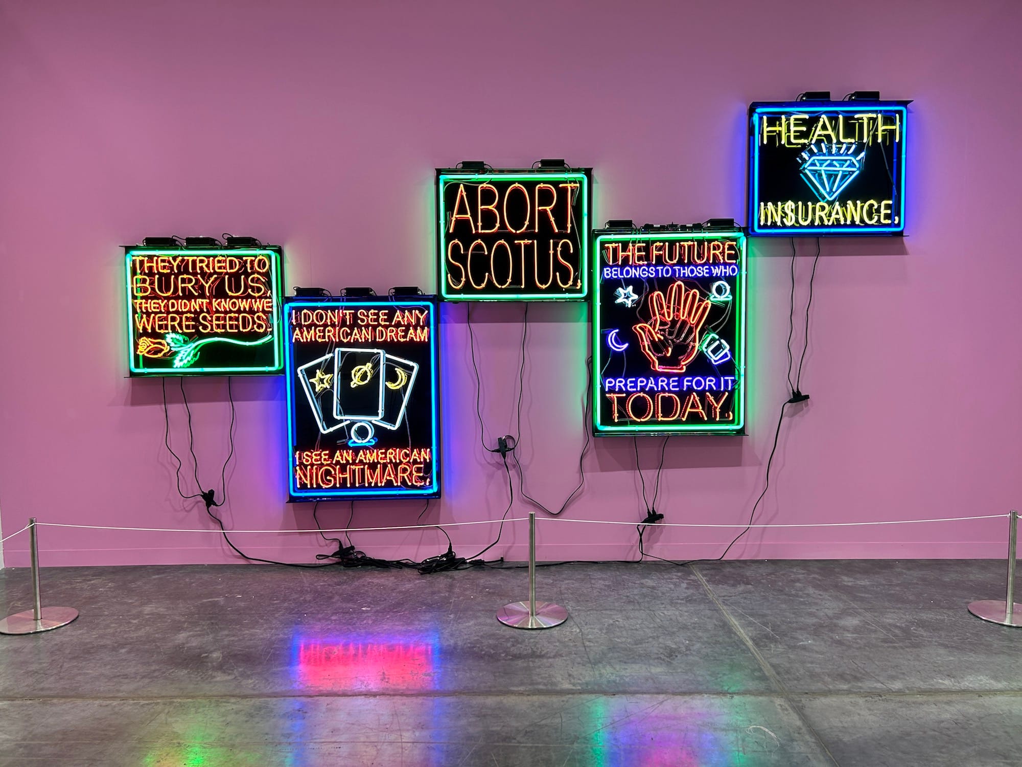 Speaking of Spanish, I noticed that both of the printed pamphlets that Art Basel offers to visitors (a floor plan and a show program) were not bilingual. In Miami-Dade County, which includes Miami Beach, two-thirds of the population speaks Spanish. Yet even Art Basel's website appears to be only in English, French, and Chinese. If the high costs of an Art Basel ticket (the cheapest regular day pass is $70, with a reduced $55 pass for students and seniors) isn't already driving away Latino Miamians, the most common ethnic group living below the poverty line in the city, I can imagine the absence of any material in their native language doesn't help. Most of the fair workers I approached during my visit — who gave me the WiFi password, pointed out the restrooms, and politely explained that I was not invited into the VIP lounge — spoke Spanish, a fact that illustrates how the on-the-ground staff makeup of the fair is different from that of the audience it aspires to draw.