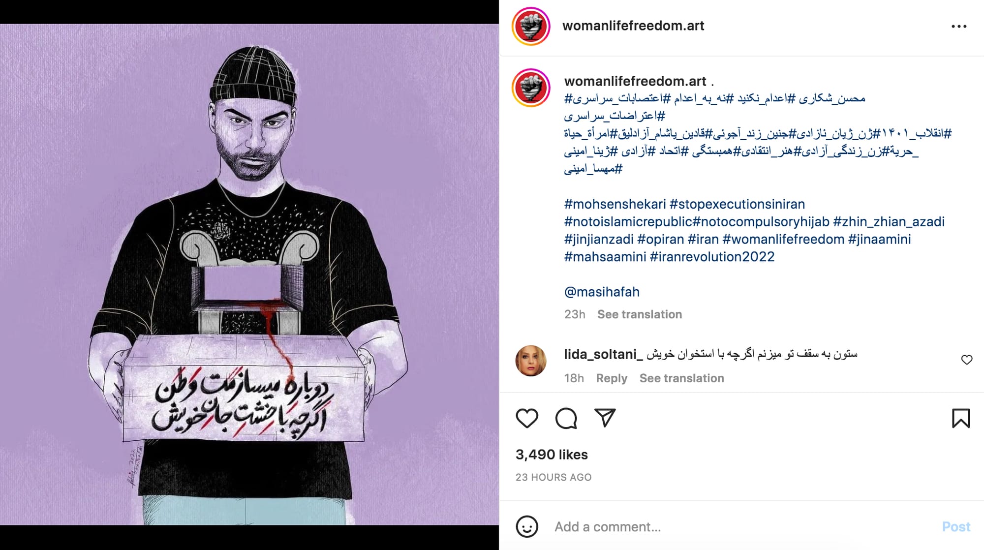 Online, dozens of artists have posted tribute artworks in honor of Shekari's life and calling for the immediate release of protesters.