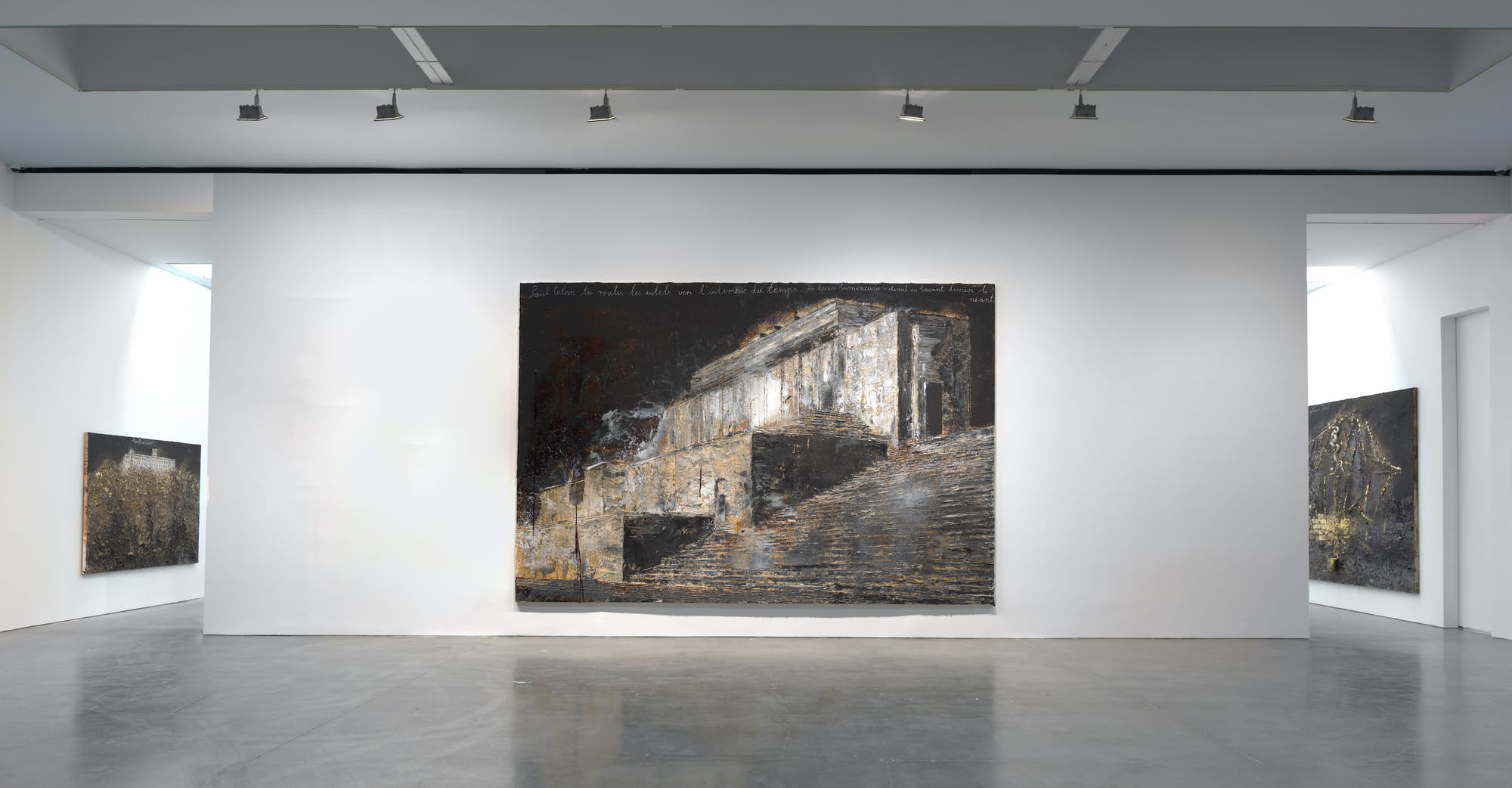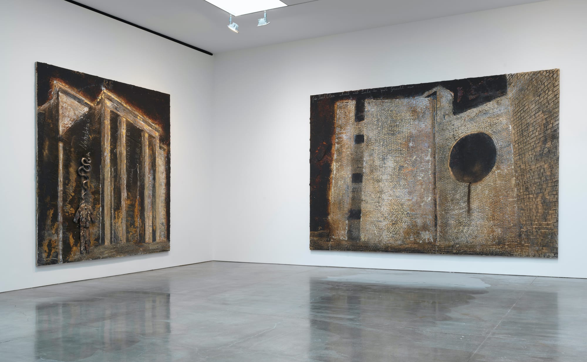 Installation view of Anselm Kiefer: Exodus at Gagosian, New York. Center: "Für Paul Celan" (For Paul Celan) (2021), emulsion, acrylic, oil, shellac, hair, and chalk on canvas, 149 5/8 x 224 7/16 inches