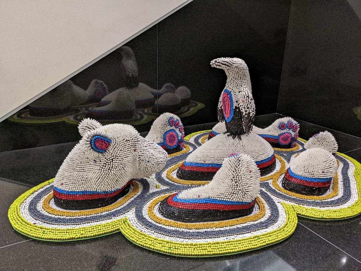 Rushing to catch a flight, some holiday travelers might mistake the sculptures for mere novelties, or fail to notice them altogether, without thinking about why the artist set the animals in ripples that suggest not only pools of water but also the interconnections between species. Perhaps others will pause to really see them, even making a mental leap to ripple effects wrought by humans bisecting birds in flight while hurling themselves through the sky in aluminum tubes.