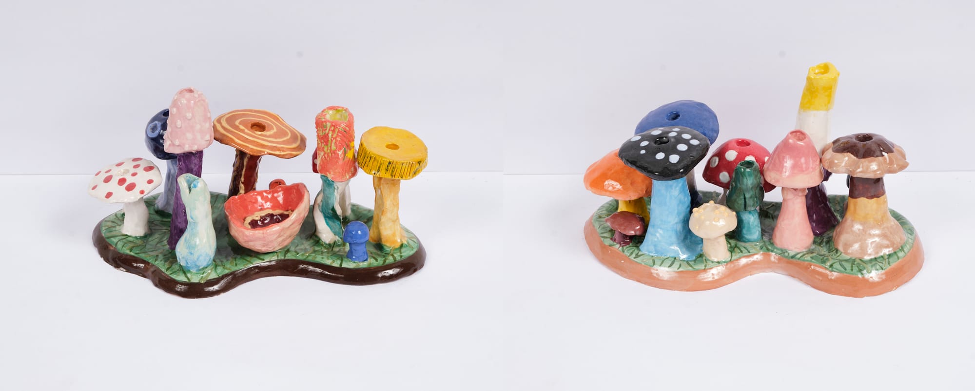 “[I] drew on the California Clay Movement to create a psychedelic fantasy rooted in Jewish stories," Noam told Hyperallergic. The mushrooms form architectural villages — like a shtetl — inspired by the bright colors of Chagall, Jewish modernism, and the forest mushrooms that emerge with the changing of the seasons."