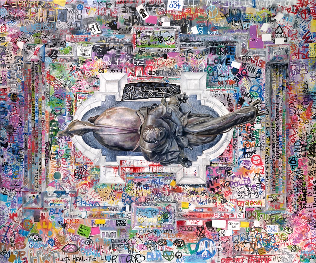 The deadly “United the Right” rally in Charlottesville in 2017 brought the monuments’ layered history and symbolism back to the forefront of public discourse. Calls for Confederate statues to be removed grew louder in May 2020, as historic protests swept the nation following the killing of George Floyd at the hands of police. Two miles from the Hill Statue on Monument Avenue, protestors toppled a Jefferson Davis statue a month later. They also turned the pedestal of an equestrian monument of Robert E. Lee, which was finally removed in September 2021, into a prominent work of protest art.