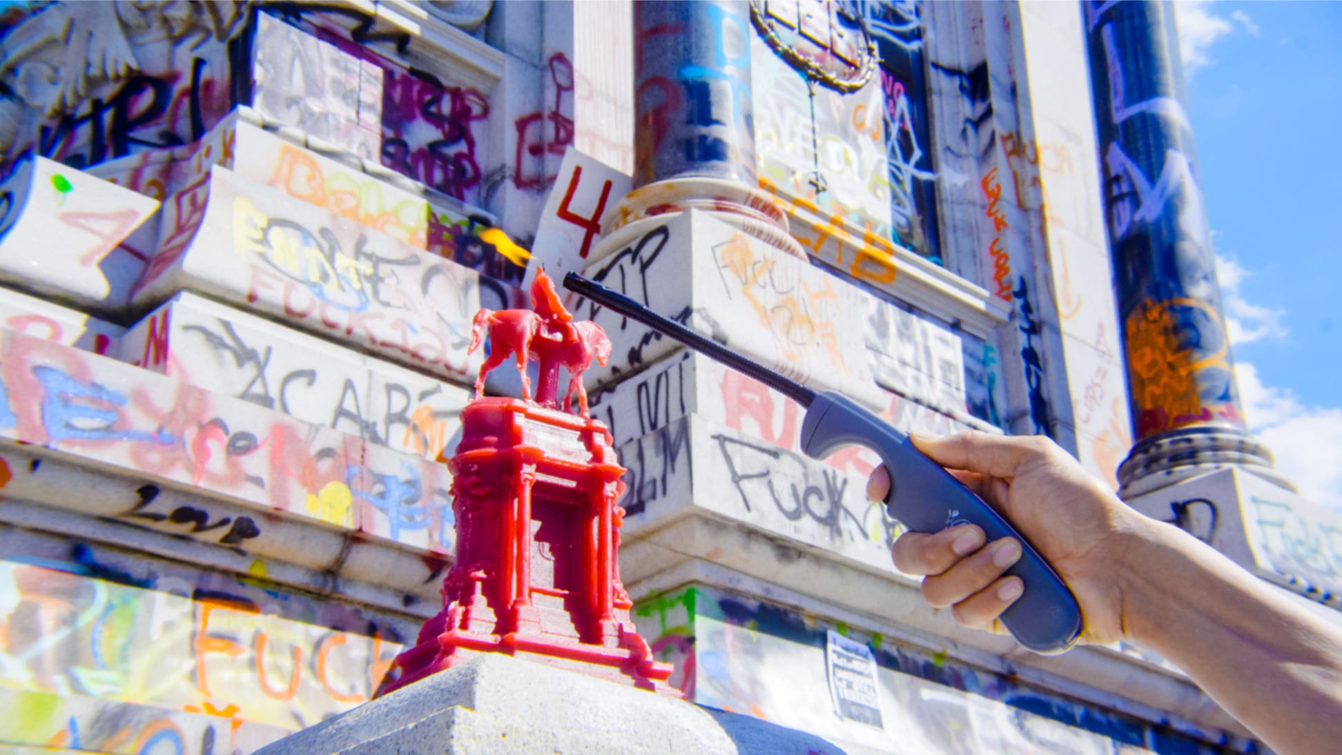Conceptual artist and University of Richmond art professor Sandy Williams IV has campaigned to see the monuments dismantled since 2017. After the white supremacist rally, Williams began their Wax Monument series (2017–2021), which turned 3D scans of statues, including those of Lee and J. E. B. Stuart, into candles. Williams sold them to raise money for local Black youth organizations. At the time, monuments depicting the likenesses of Lee, Jackson, and others seemed so permanent that Williams wanted more agency for Black Southerners over public narratives around Civil War and Confederate history.