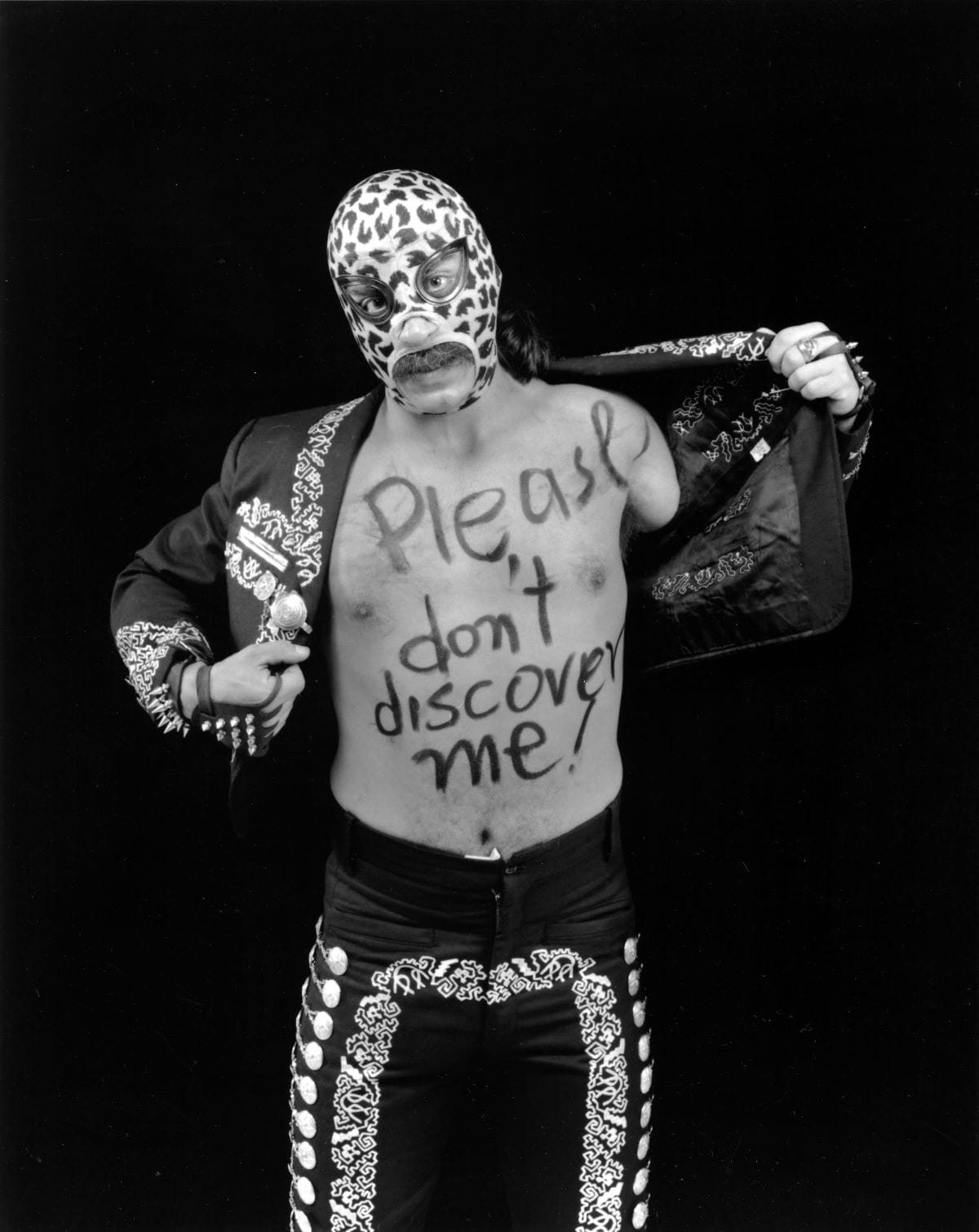 Other artists use Lucha Libre to tackle issues such as colonialism, as in Guillermo Gomez Peña’s “Warrior for Gringostroika” (1992), a reaction to Columbus “discovering” America. The image shows Peña with “Please don’t discover me!” written on his abdomen and wearing a traditional jaguar wrestling mask, a motif, frequently favored by wrestlers, that comes from Mayan and Aztec designs.