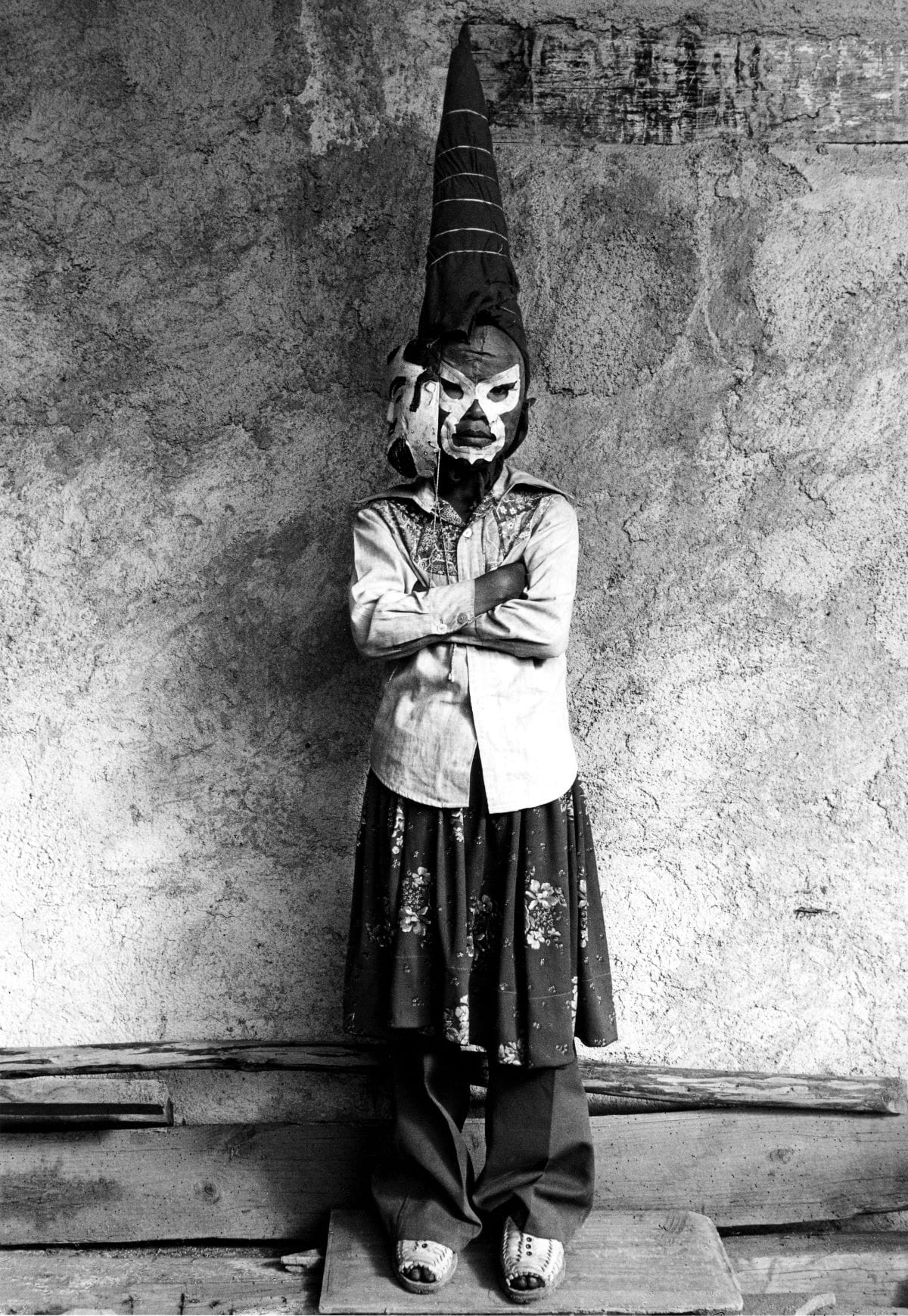Graciela Iturbide’s “Jano, Ocumichu, Michoacán, México” (1981), features a young indigenous girl wearing two masks. “This image really speaks to the Mexican identity,” says Morales. “One mask is a traditional Indigenous mask for what they call the Old People Dance. The other is the Blue Demon mask. It’s a really interesting combination of traditional and contemporary culture.”