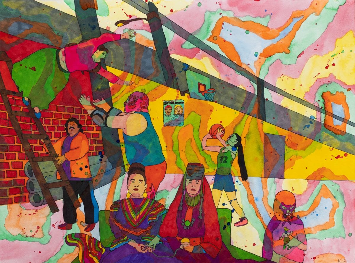 For many, Lucha Libre represents something more personal and intimate. Karla Diaz’s “Las Dos Luchas/The Double Fight” (2022), from a series of new watercolors created for the exhibition, features scenes from the artist’s life punctuated with scenes from lucha. Made after she underwent brain surgery, these paintings illustrate the Diaz’s healing journey as she began to recover her memories.