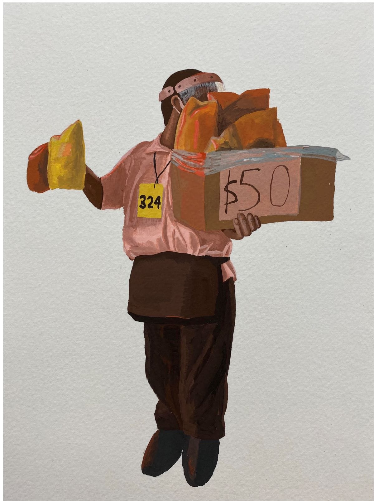 Other artists remind viewers that it’s not just about the wrestlers. Katayoun Vaziri’s series of gouache paintings pay homage to the workers that perform some of a wrestling match’s less glamorous but no less important work.