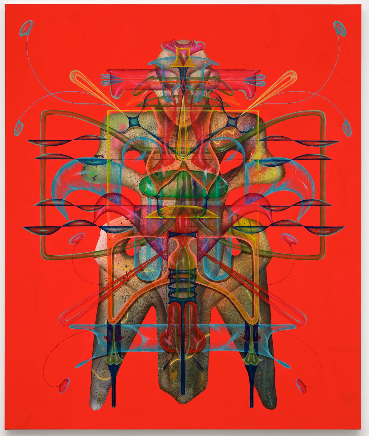 Nevena Prijic’s paintings explore a bio-futurist fusion of body and technology. Through semi-transparent layers of color, she renders suggestive organic shapes alongside hard-edged geometries that update modernist prototypes of the “man-machine.” Resembling psychedelic Rorschach blots, her forms are influenced by Neolithic Vincha sculptures produced thousands of years ago in what is now Serbia, updated with space-age pinstriping and corporeal details of humans, animals, and insects.