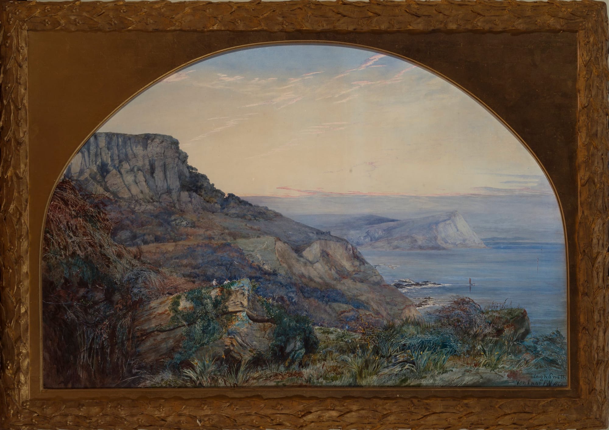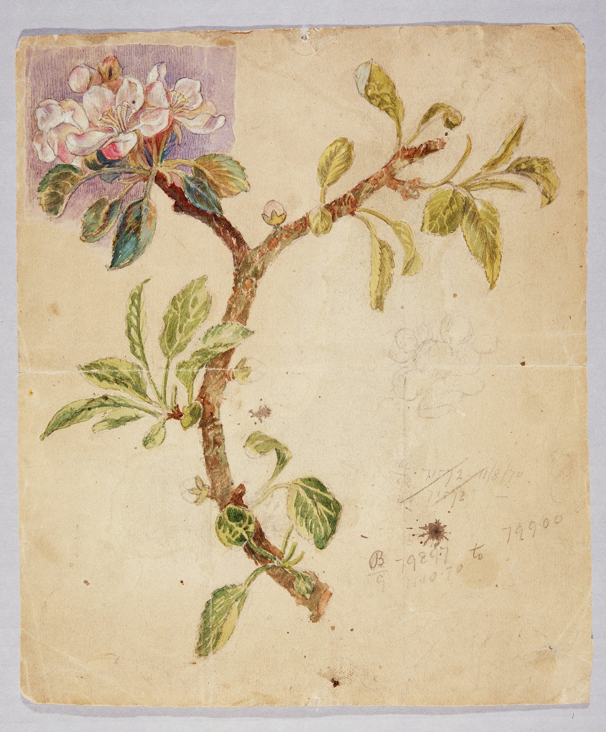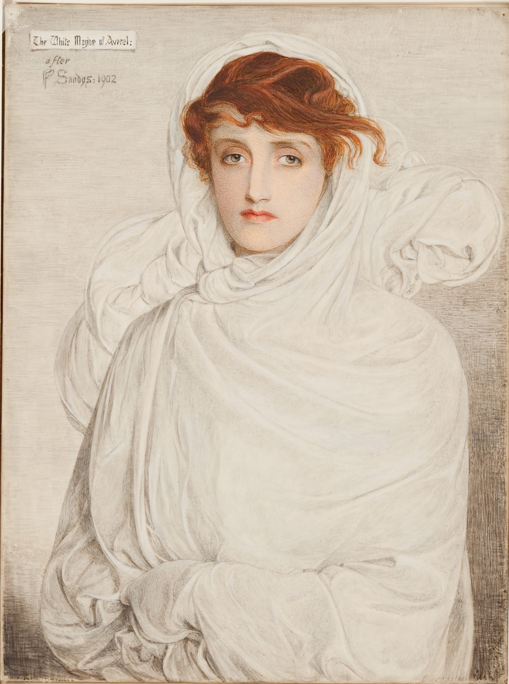 That earlier Pre-Raphaelite aesthetic of almost photographic realism is evident in some of the works in Forgotten Pre-Raphaelites, such as George James Howard’s “Algiers, Cecilia in Pink” (c. 1892–93) and Barbara Leigh Smith Bodichon’s “Ventnor, Isle of Wight” (1856). Tellingly, the museum has hung Frederick James Shields’s “Apple Stem” (1878) next to a botanical drawing by John Ruskin (the founding Pre-Raphaelites’ mentor and patron), underlining the movement’s pursuit of naturalistic detail. Indeed, the only work in Forgotten Pre-Raphaelites that evokes the stunners of Rossetti or Burne-Jones is Winifred Sandys’s fine watercolor “White Mayde of Avenel” (after 1902).