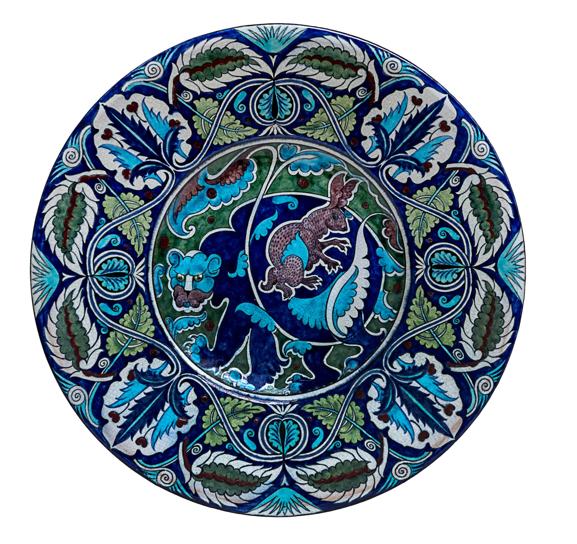 The artistic “power couple” Evelyn and William De Morgan, represented in the museum's A Marriage of Arts & Crafts: Evelyn & William De Morgan, clearly had impeccable Pre-Raphaelite affiliations. Evelyn studied at the Slade School of Art, one of the few institutions where women students could draw from the nude; she came of age, thanks to her painter uncle John Roddam Spencer Stanhope, among a circle that included Morris and his family, Burne-Jones, Rossetti, and a crowd of other Pre-Raphaelite-adjacent artists. Trained at the Royal Academy as a painter, William designed stained glass and tiles for Morris’s design firm before founding his own ceramics studio.