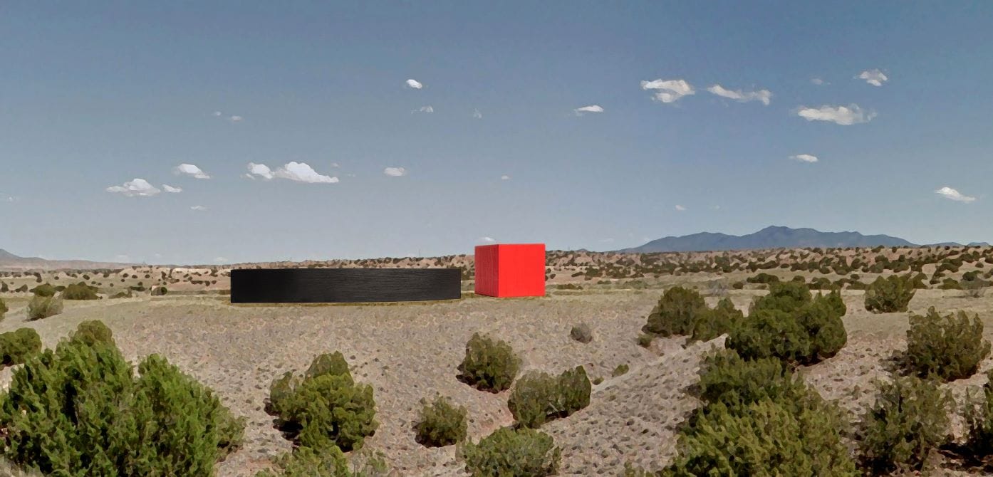 “He calls it a ‘radical attractor,’” Hart says, pulling out a sketch by Reggio and a few of his own digital renderings. The main exhibition space is a jet black, oblong form inspired by a Viking ship, a cultural reference point for some of Price’s works. Next to it is a bright red cube, which would house a gift shop and administrative offices. Both structures are windowless, so the subdued presentation of the Phil Space show is something of a proof of concept.