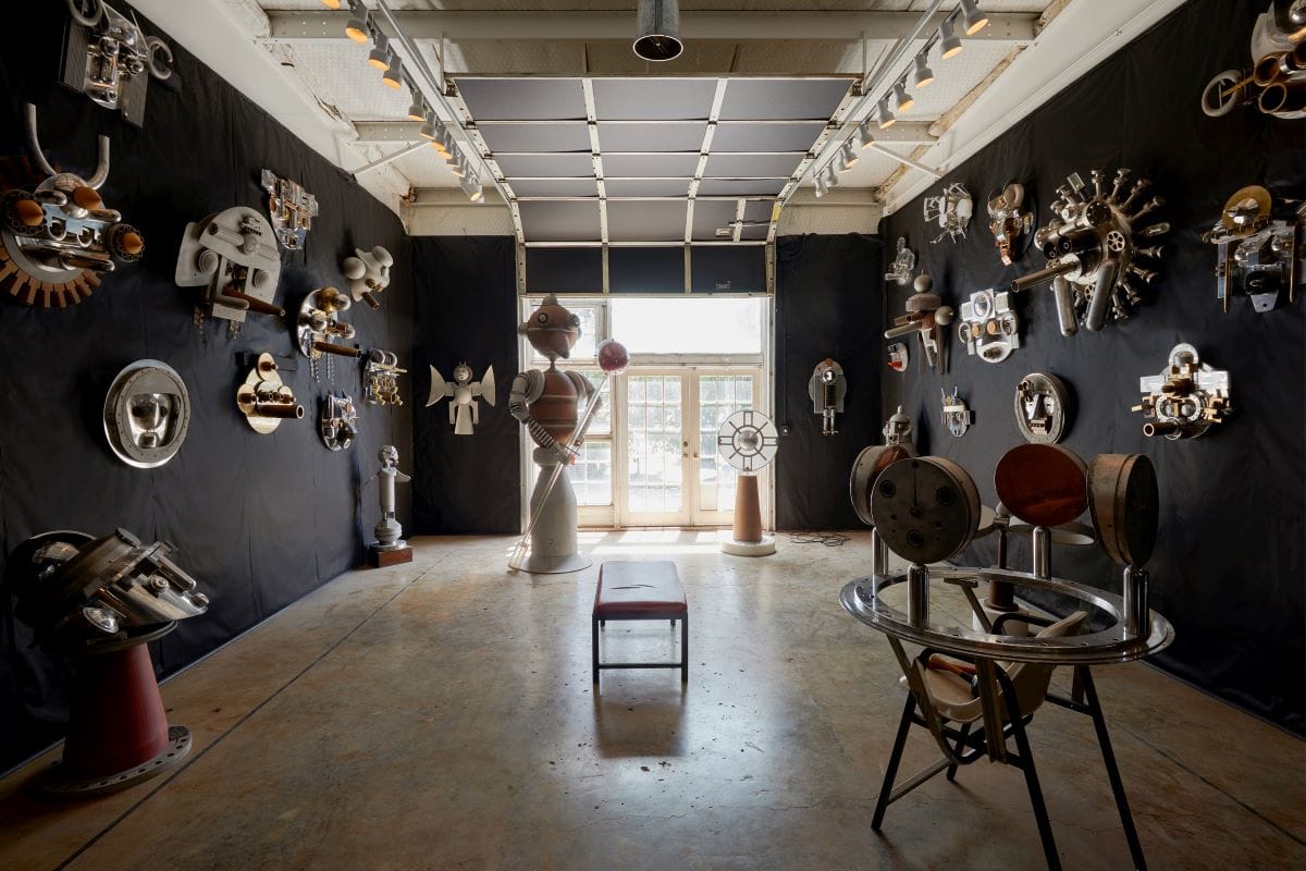 “I do think I’ve gone crazy because they do speak to me,” says Hart, scanning the metallic faces that float in the void. In addition to running Phil Space, Hart is the president of the nonprofit Friends of Tony Price, established after the artist’s death in 2000.