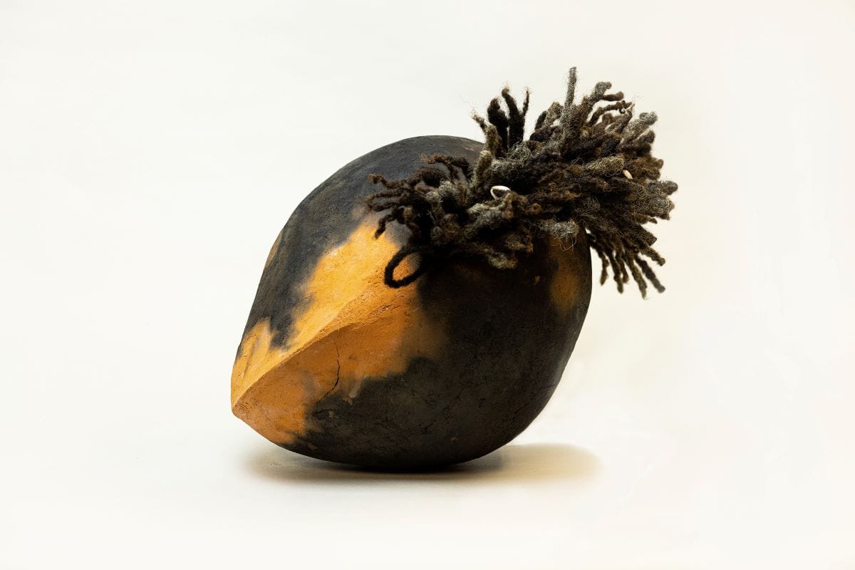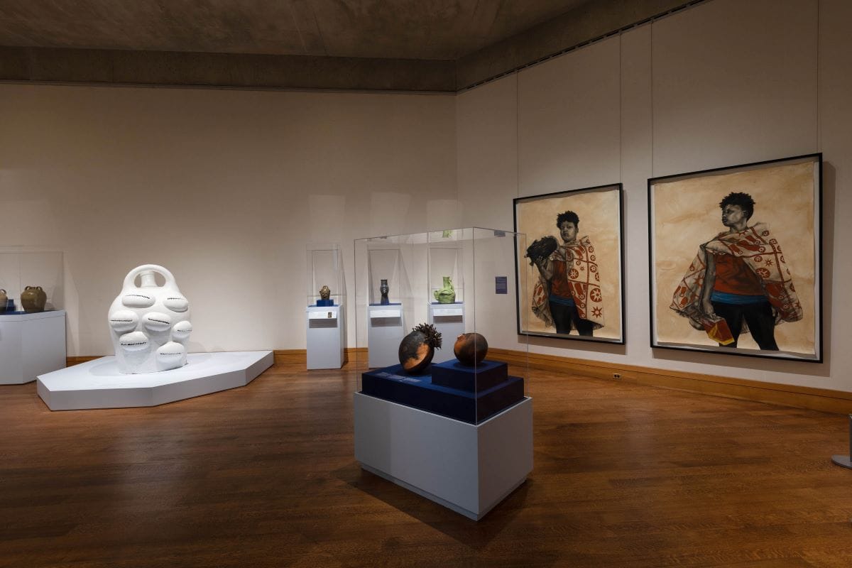 Alongside other Edgefield vessels made by anonymous people who were enslaved, the exhibition also features a work by Drake and Mark Jones (Drake’s possible apprentice) signed "Mark and Dave." Jones, another potter who was enslaved by Lewis Miles, may have aided Drake in turning the vessels, given the latter was missing a leg. These works are paired with face jugs that emerged in the mid-nineteenth century, coinciding with the arrival of slave ships that illegally transported hundreds of captive Africans 50 years after the transatlantic slave trade was outlawed in the United States. Hundreds of these enslaved people were sent to Edgefield. These face jugs — small and detailed with ridged teeth, unspooling tongues, and protruding eyes — closely resemble minkisi, sacred religious objects in West-Central Africa understood to facilitate communication between the living and dead. This pairing speaks to the devotional genealogy of all the vessels on display — vessels both in their day-to-day use and metaphysical vessels that point away from the brute conditions of their making. The choice to include Simone Leigh’s “Large Jug” (2021–22), inspired by an Edgefield jug and with cowrie shells in the place of eyes and nose, alongside other contemporary Black artists like Woody de Othella, Robert Pruitt, and Theaster Gates, is commendable. It relays art history as a true concatenation, one rife with anguish and overcomings. Hear Me Now unfolds material history as chronicled by its repeatedly overlooked makers — museums and curators ought not shy away from such tellings.