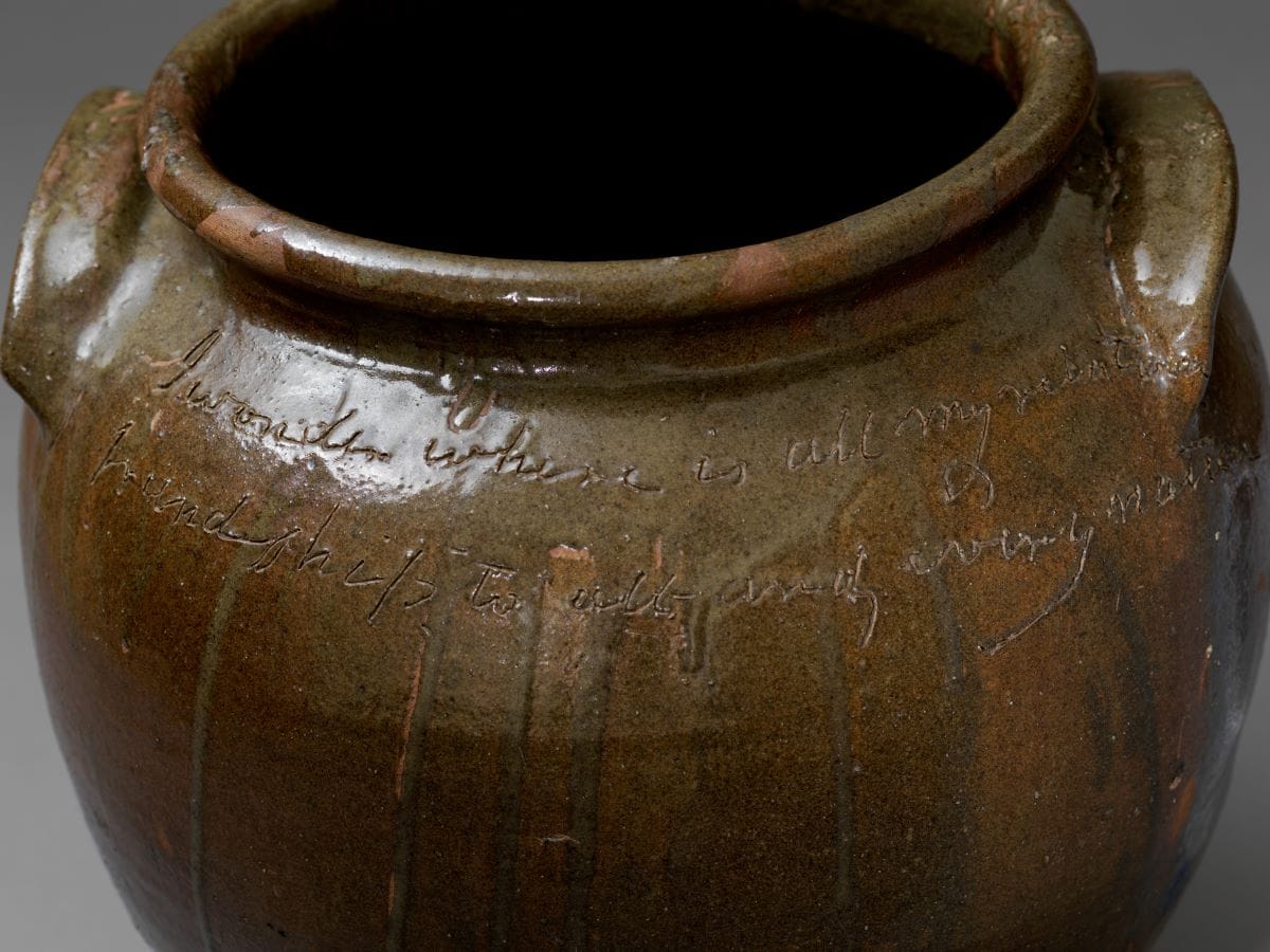 Comprised of approximately 50 ceramic objects from Old Edgefield, a center for stoneware produced by generations of enslaved Africans in the antebellum South, the exhibition tethers together an expansive survey of the ceramics produced by African-American potters, with Drake’s prodigious, alkaline-glazed ceramic serving as the exhibition’s anchor. Discerning Drake’s aesthetic achievements from his audacious personal life is near impossible — all the more so when we consider Drake’s transcriptions, contemplative reflections on his life as an enslaved man, carved in his wares. As Laban Carrick Hill recounts in Dave the Potter: Artist, Poet, Slave (2010), Drake was one of 76 people captured and enslaved in the Edgefield District of South Carolina who worked for family-owned pottery factories. As an American industry, alkaline-glazed stoneware began in the early 1800s, after Abner Landrum found kaolin deposits in Western Carolina, soon transforming the village of Pottersville to meet the economy of a burgeoning plantation economy — these vessels would supply the region with storage for food and goods.