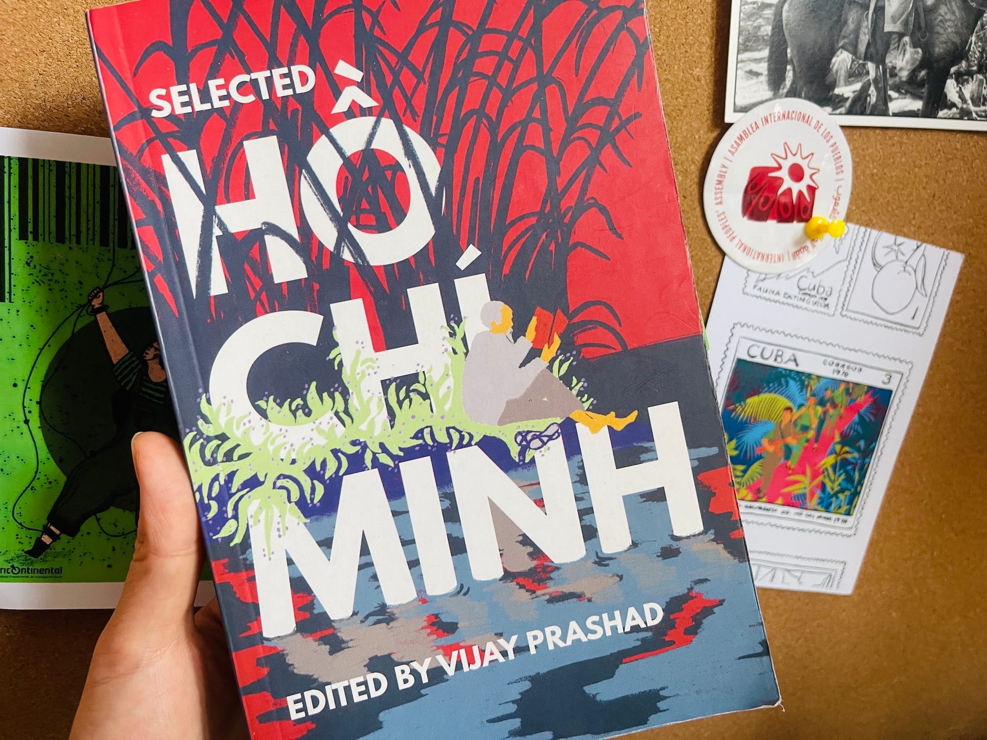 Selected Hồ Chí Minh, edited by Vijay Prashad, LeftWord Books, 2022, with digital collage based on René Mederos painting of Vietnamese guerilla fighters (2018) in the background (photo Tings Chak/Hyperallergic)