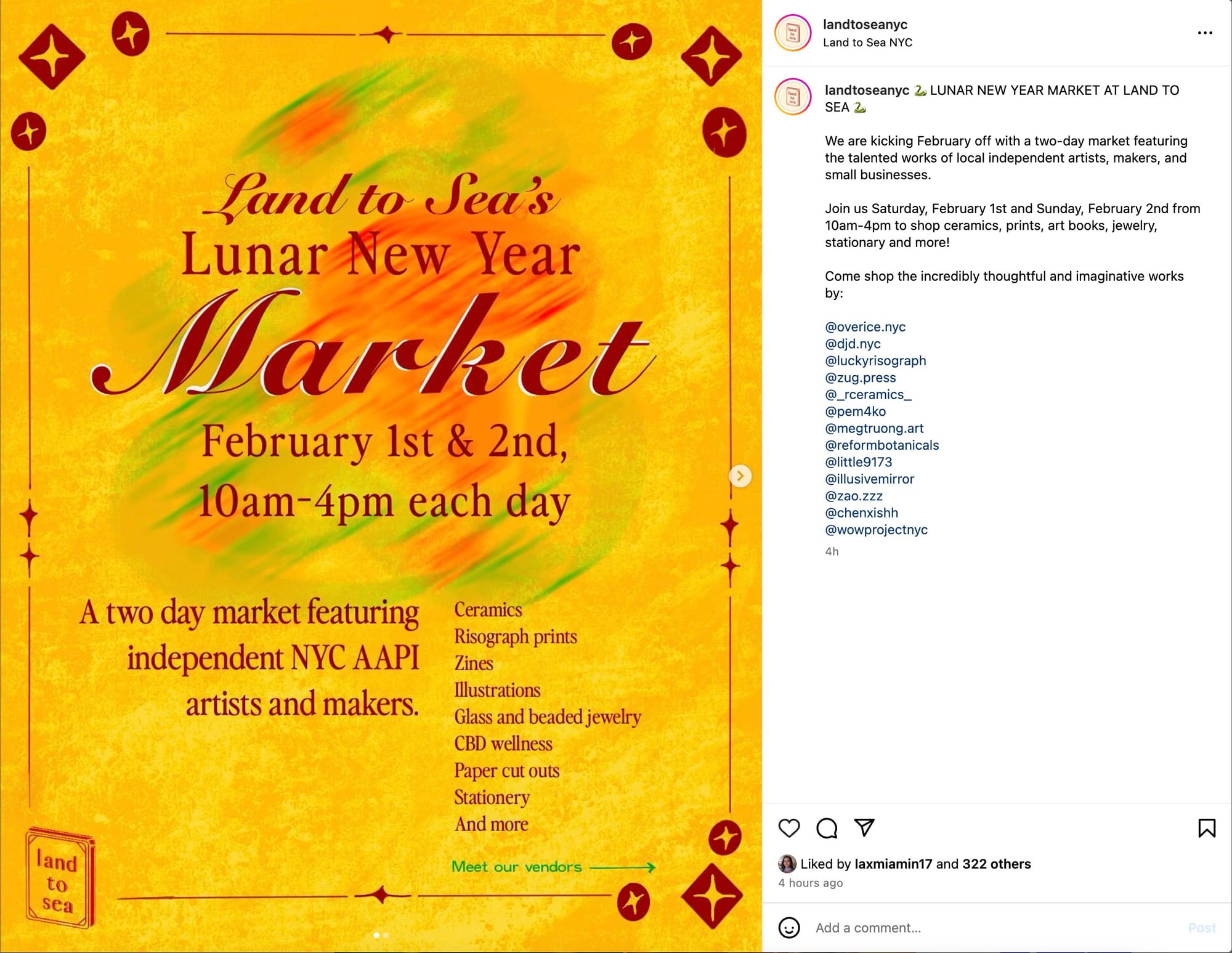 Last but not least ... What could be better than supporting a local Asian American and Pacific Islander (AAPI) artist or creative small business in the Year of the Snake? The Asian- and women-owned Brooklyn cafe Land to Sea will become an art marketplace on the weekend of February 1, with multiple independent vendors selling glass and beaded jewelry, ceramics, risograph prints, small art books, stationery, and other decorative wares for your home and self.