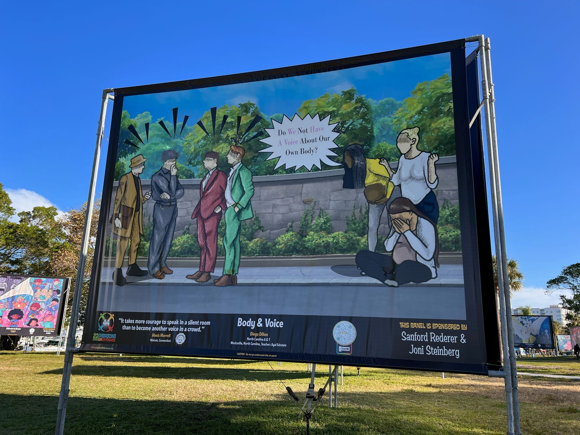 The school told the Sarasota Herald-Tribune that it deemed “Good Trouble” by Clifford McDonald, a collage depicting a young Black boy, civil rights leader John Lewis, and the letters BLM, “potentially offensive.” The college also reported issues with Diego Dillon's “Body & Voice,” which portrays a pregnant woman asking a group of men, “Do We Not Have A Voice About Our Own Body?” and a caption for "Being Different Gives the World Color" by Taira Akiko Hiraguri written by Indian fifth-grade student Raaina Chadha that reads, “Diversity and inclusion are like the needle and thread that stitch together the harmonious fabric of peace for humankind.”