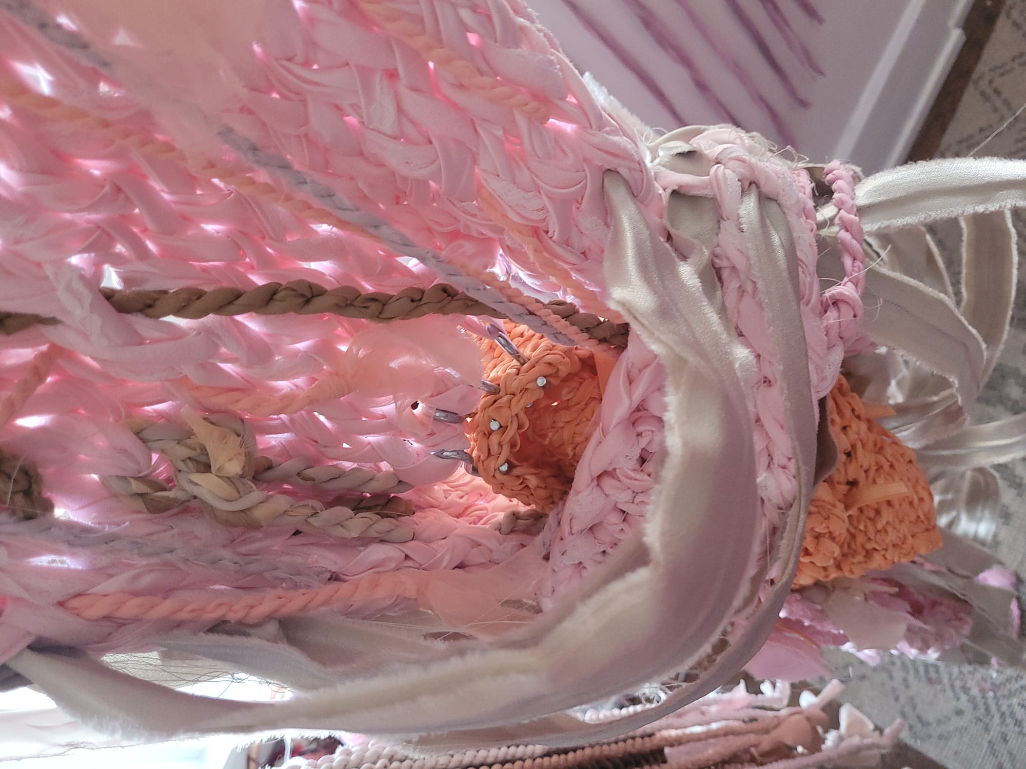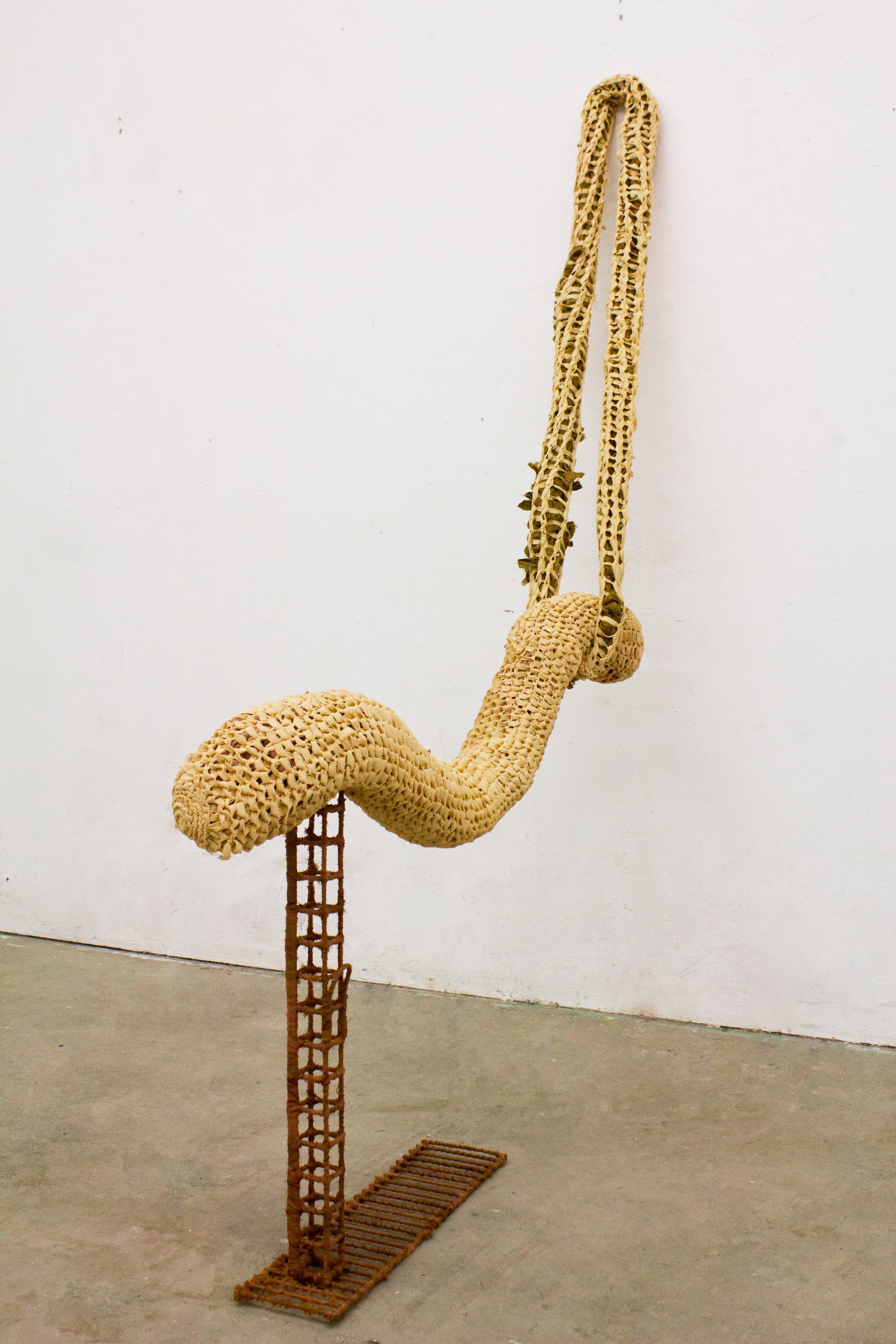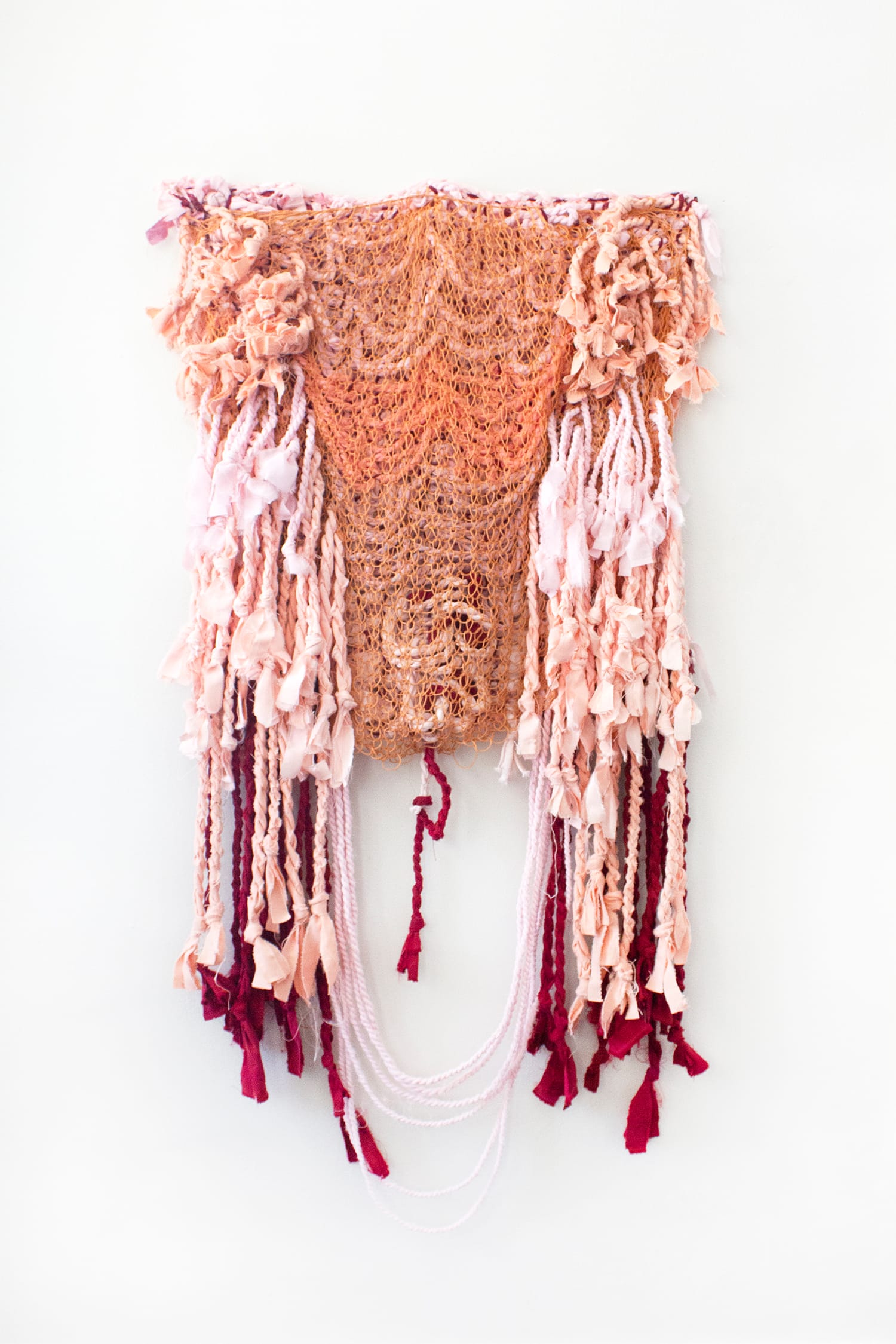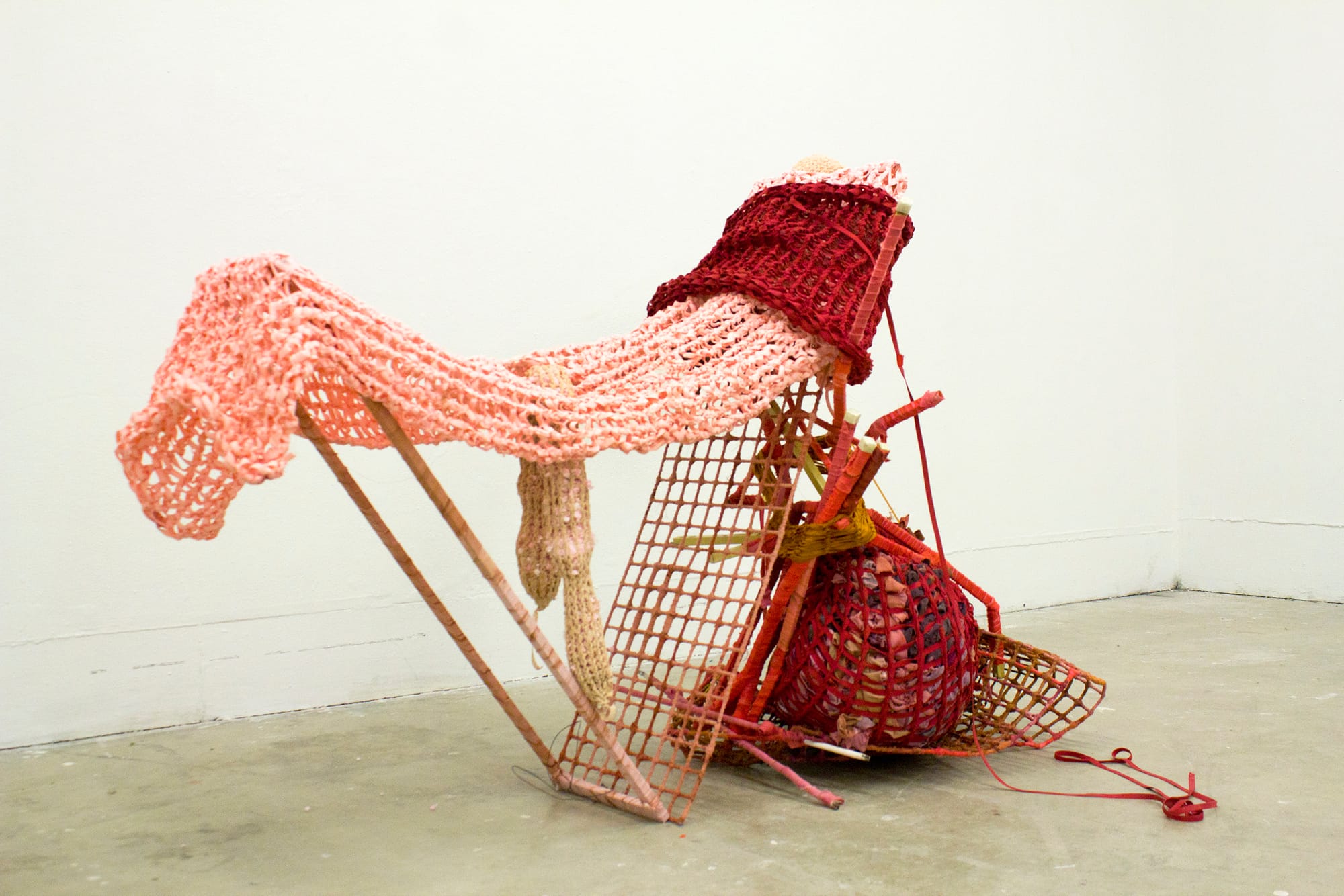 Shulman’s constructions are quite bodily, and vary in size, shape, and materiality, but they tend to be comprised of three basic components: handmade or sourced rope or strapping that is knitted on or off-loom, found metal armatures that provide stability, and interjected objects (often made of wood, but sometimes softer). Shulman dyes her fibers into visceral magentas and pinks, so her studio is festooned with hanging objects that evoke, among other things, a butcher shop full of unidentifiable cuts of meat, or a meat locker of anonymized bodies with their own evasive logic.