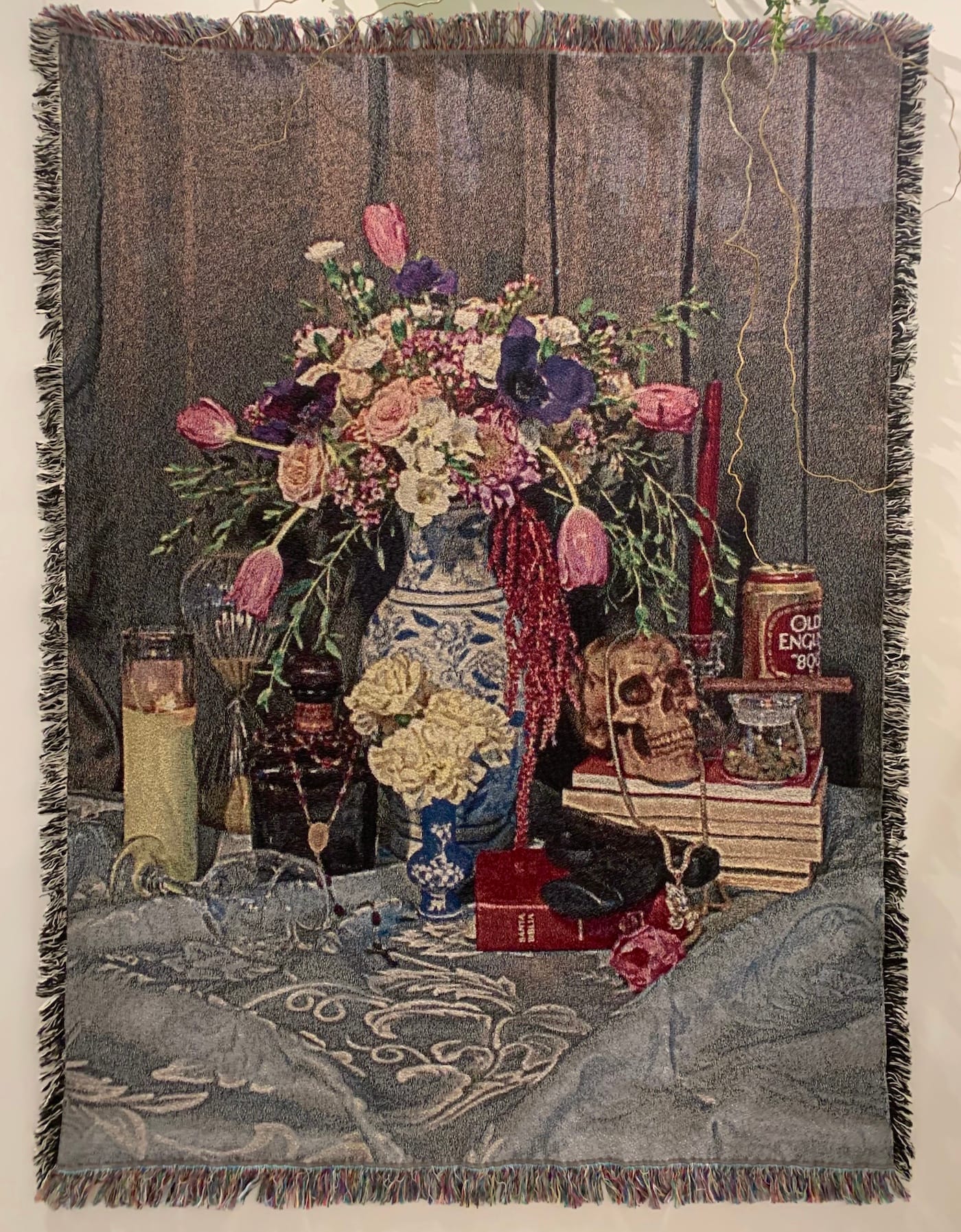 In addition to the paintings, the exhibition features two industrially woven tapestries, referencing Mexican artisanal weaving, mass-produced blankets ubiquitous in many Latino homes, African-American quilting traditions, and Medieval European tapestries. A traditional Vanitas still life is updated with a firearm, a can of malt liquor, and a jar filled with marijuana, transforming it into a “hood vanitas,” as Pittman describes it.