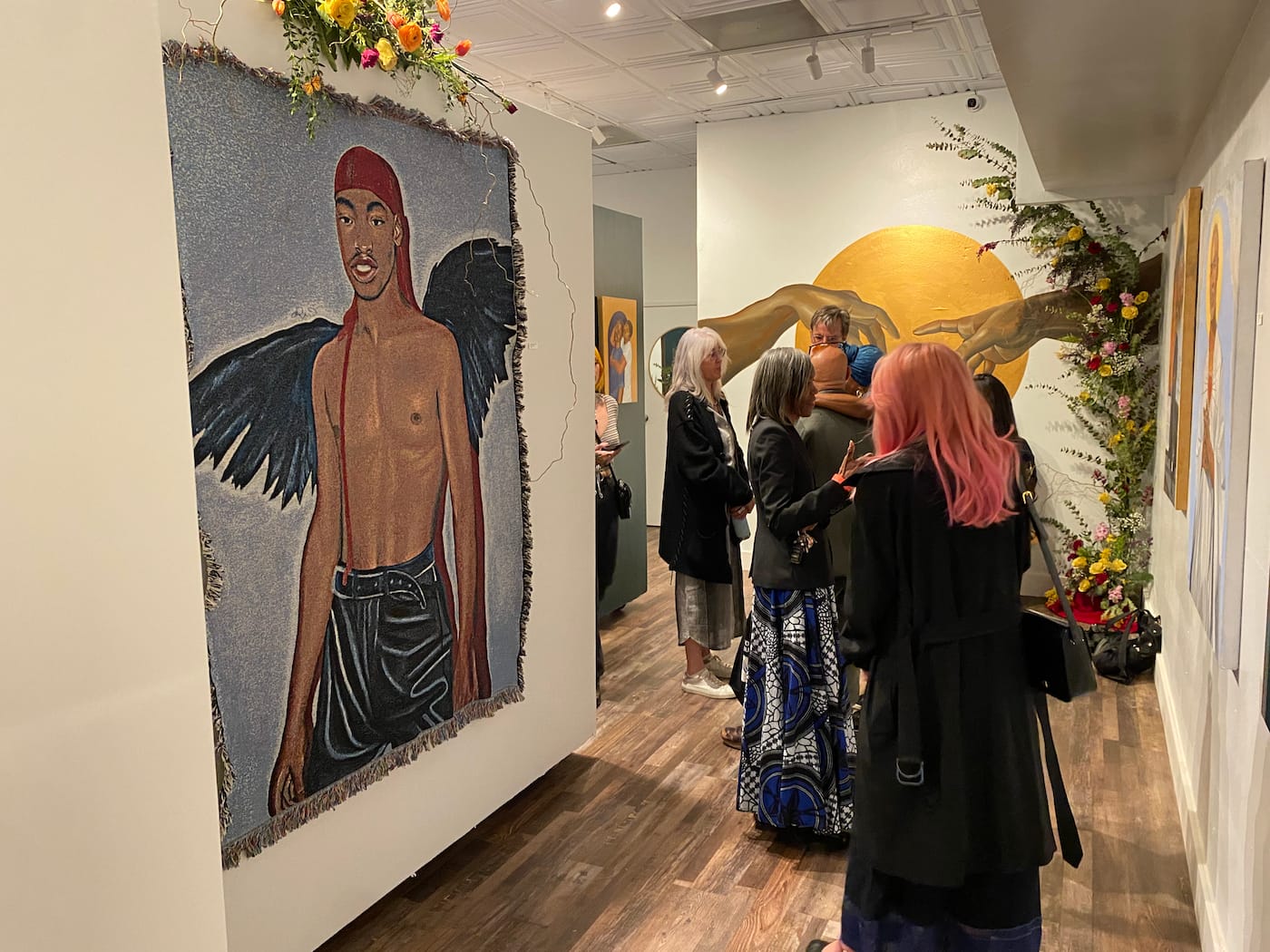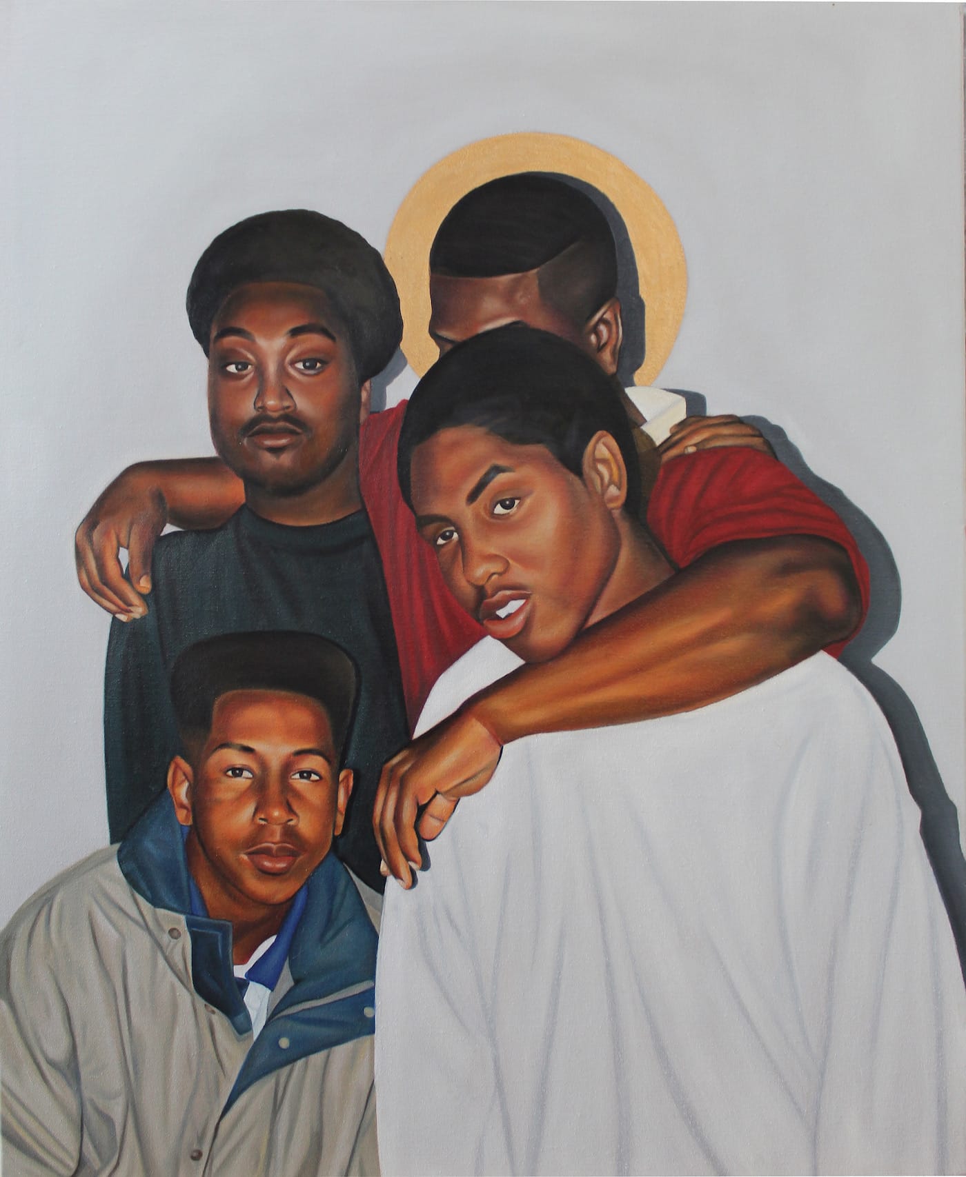 Pittman’s works reflect his Black and Latino background, interwoven with elements from European art history, Afro-Futurism, and contemporary music. Quotes from songs by another native son of Compton, Kendrick Lamar, line the walls. Black members of his family are depicted as saintly figures with golden halos, including a portrait of his father, who is shown in front of a police car as two pitbulls hover supernaturally overhead. Those are Pittman’s childhood dogs, who were killed by sheriff’s deputies when they escaped the yard, coming back as guardian angels to protect his father. “That was my first big loss as a child,” he says.