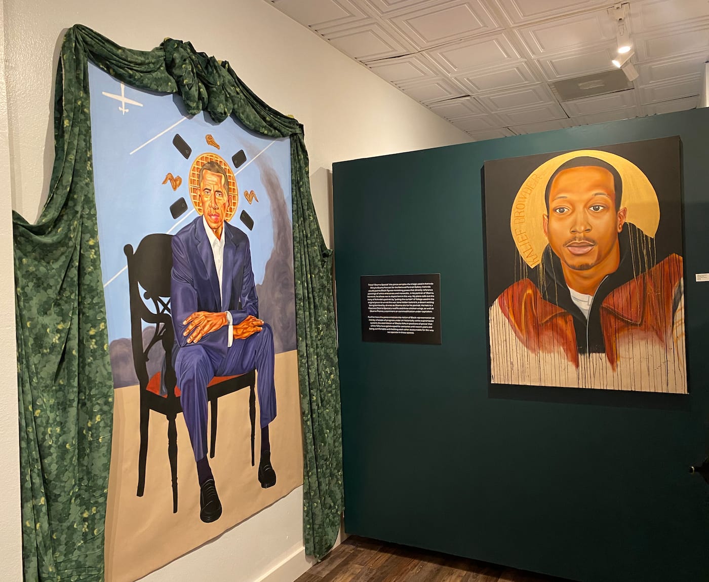In other paintings, Pittman confronts contemporary issues, as in a portrait of Kalief Browder, who was held at Rikers Island jail for several years without trial after being accused of stealing a backpack. He spent 700 days in solitary confinement and hung himself two years after being released, his death leading to calls for prison reform. Nearby hangs Pittman’s response to Kehinde Wiley’s portrait of Barack Obama, offering a less celebratory vision of the former president's legacy. Pittman copies the Obamas' pose from Kehinde Wiley’s well-known painting, but turns the green hedge into a curtain, pulled back to reveal a desert drone strike. His head is ringed by a halo-like waffle and floating chicken wings, referencing the Obama Special at local iconic restaurant Roscoe’s House of Chicken ‘N Waffles, a jab at the uncritical adulation often heaped on him.
