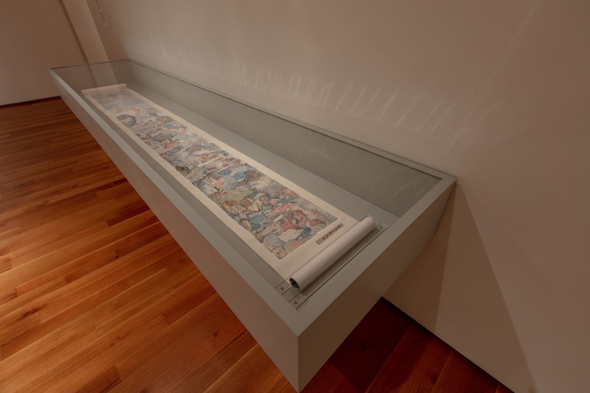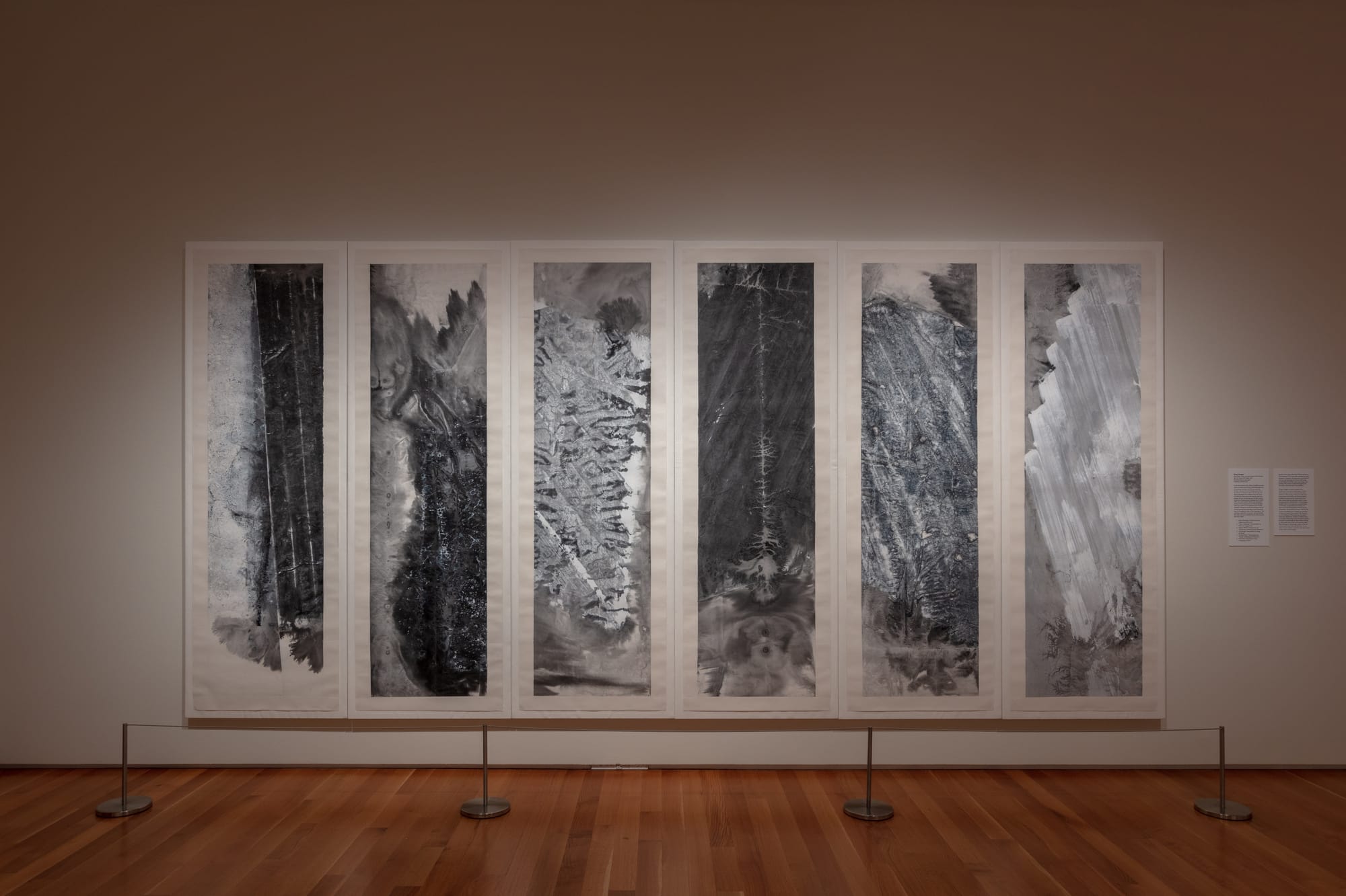 Of course, ink painting on paper does not disappear completely from the exhibition. Bingyi’s “Can The Eyes Sing? The Bodies of the Sacred Mountains” (2021–22) is a wall-sized tour-de-force that envelops the viewer’s body. Though inspired by nature — the artist created the massive painting while staying in the Taihang Mountains — its swirling, pulsating brushstrokes evoke a psychic more than a physical landscape. In the next room, Yun-Fei Ji’s 10-foot-long scroll “Three Gorges Dam Migration” (2008) is a delicate but engrossing take on China’s rapid modernization using traditional ink-painting techniques.