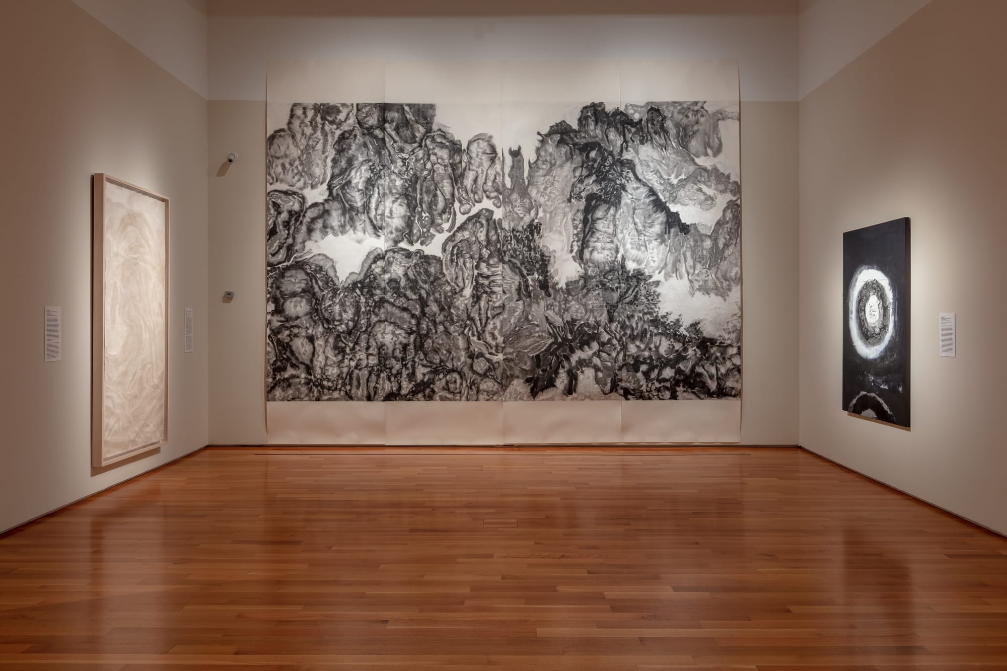 Other artists relinquish traditional materials completely. Wu Chi-Tsung’s “Wrinkled Texture 113” (2021) appears from across the gallery to be a deftly executed painting of cresting waves or craggy mountains, but up close the piece reveals itself as a cyanotype made from crumpled paper exposed to light. Nearby, Fu Xiaotong’s densely textured “719,560 Pinpricks” (2019) relinquishes paintbrush and ink completely, creating a lush vista from only the repeated, expert incisions of a needle. Fu’s piece is a gentle rebellion against tradition that also subtly brings ink painting into three dimensions.