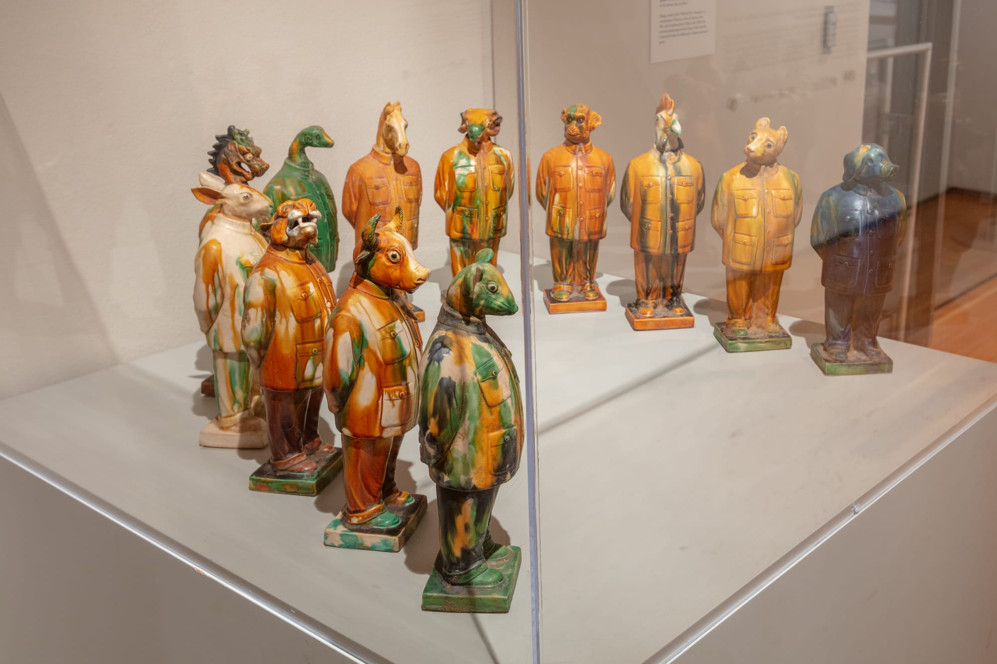 “This exhibition is about building an intergenerational conversation about how artists today are pushing the boundaries and plumbing the depths of different Chinese artistic traditions,” Duffy told Hyperallergic on a recent tour. The 50-plus artworks on view take on tradition by reinterpreting cultural influences — artistic conventions and techniques, as well as poems, stories, plays, and literature — from a wide range of historical periods, decades and even centuries in the past. For example, Zheng Chongbin’s large ink painting “New Six Canons (Xin Liufa)” (2012) references a fifth-century text on the fundamentals of Chinese ink painting, while Zhang Hongtu’s tongue-in-cheek “Zodiac Figures” (2002) condenses old and new as tricolor Tang dynasty-style ceramic animals don the outfit worn by popular figurines of Mao Zedong from the 1950s and 1960s.
