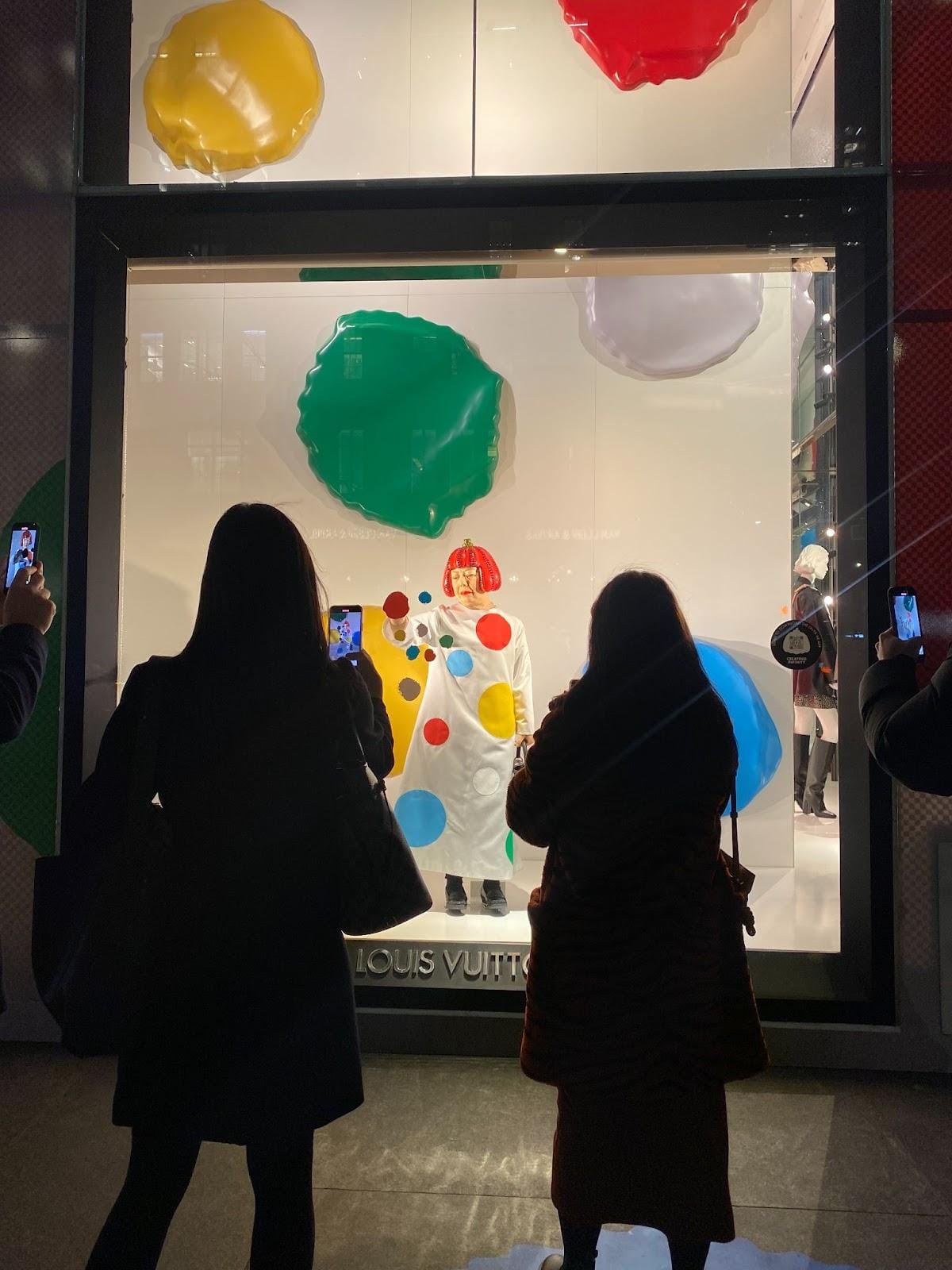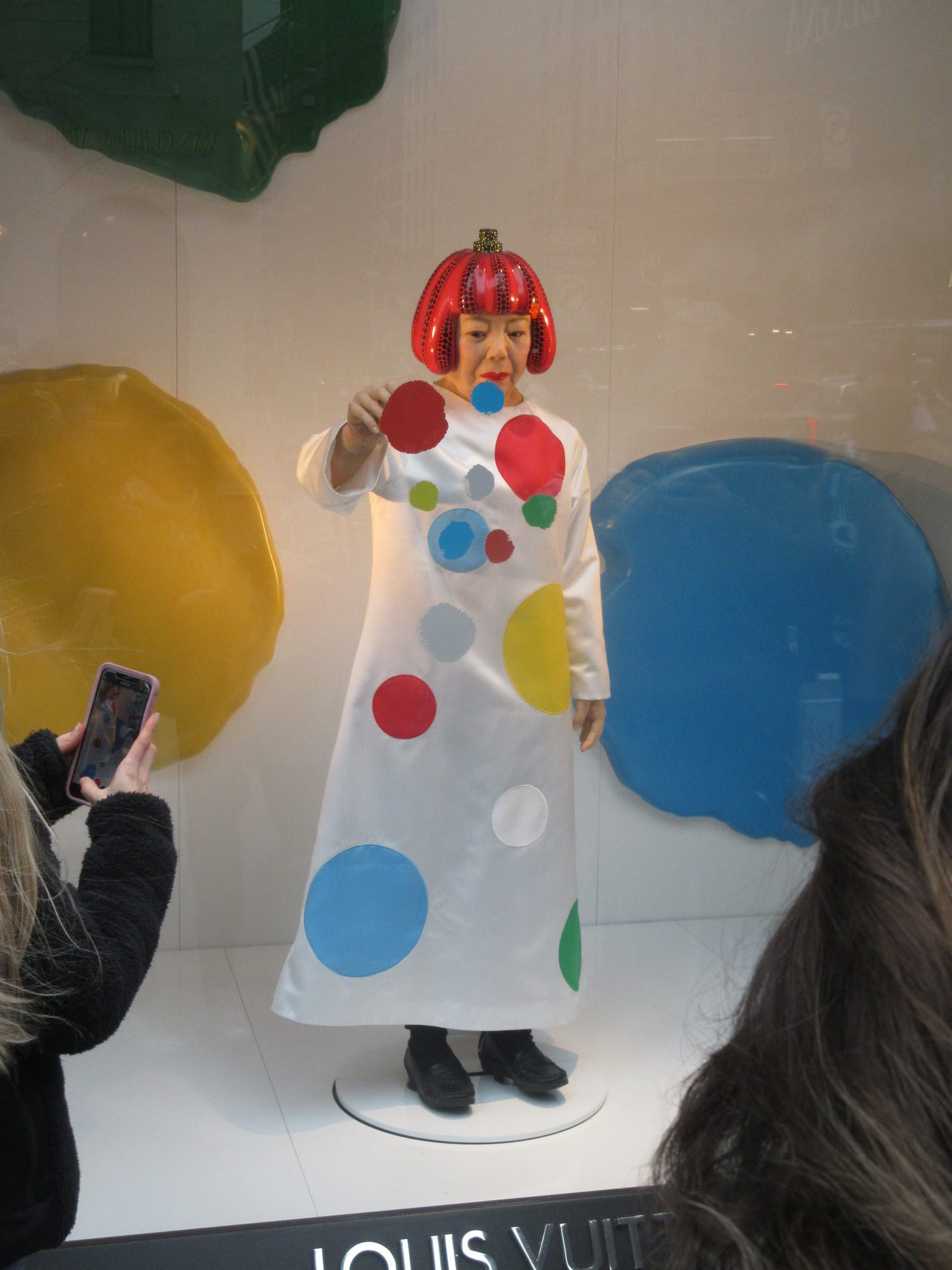 Spotted: this side of Fifth Avenue is dotted with massive paint blob stickers, realistically rendered in the artist’s brushstrokes, touching the feet of everyone who passes. The artist is Yayoi Kusama, commonly known as “the princess of polka dots” and one of the highest-selling living female artists. These decorations are a part of Louis Vuitton’s new rounds of global campaigns in collaboration with Kusama.