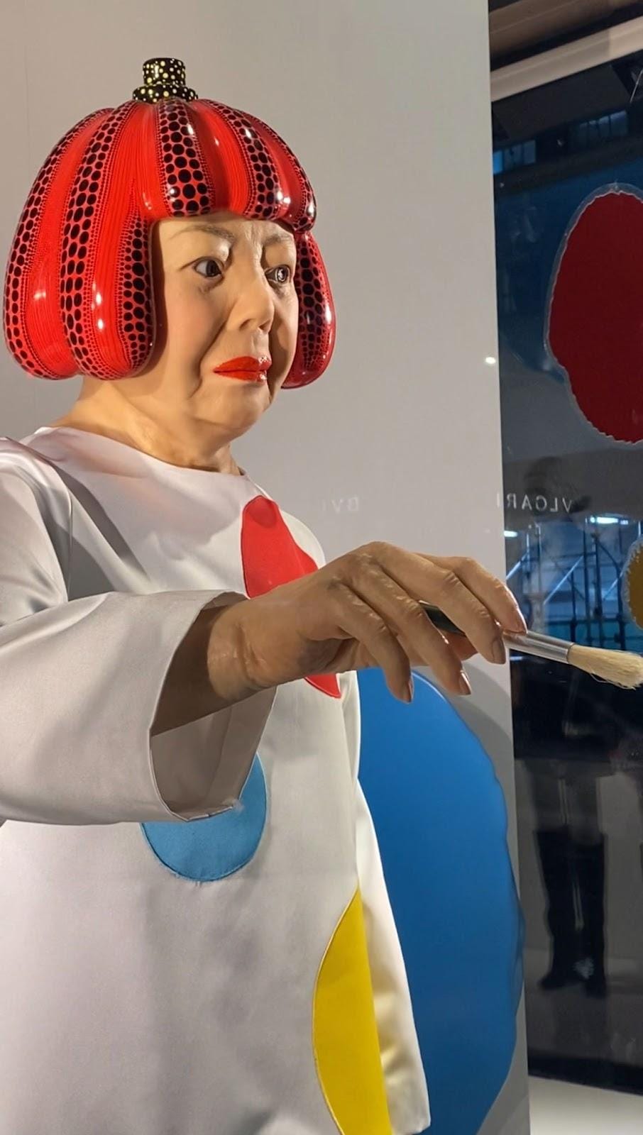 I too found myself drawn to the color-dotted sidewalk of Fifth Avenue. I searched for my phone upon seeing the uncanny dots and many onlookers, feeling slightly insecure about the fact that I did not already have it in hand. I zoomed in towards the window frame, my attention caught by the wrinkles on the animatronic Kusama’s face under the shiny, red polka-dotted pumpkin helmet. I observed her pouchy eyelids weighing on her signature (in)expression of skepticism — the rounded stare imbued with a hint of obsession that is irreducible even to its robotic facsimile. I waited for it to turn toward me.