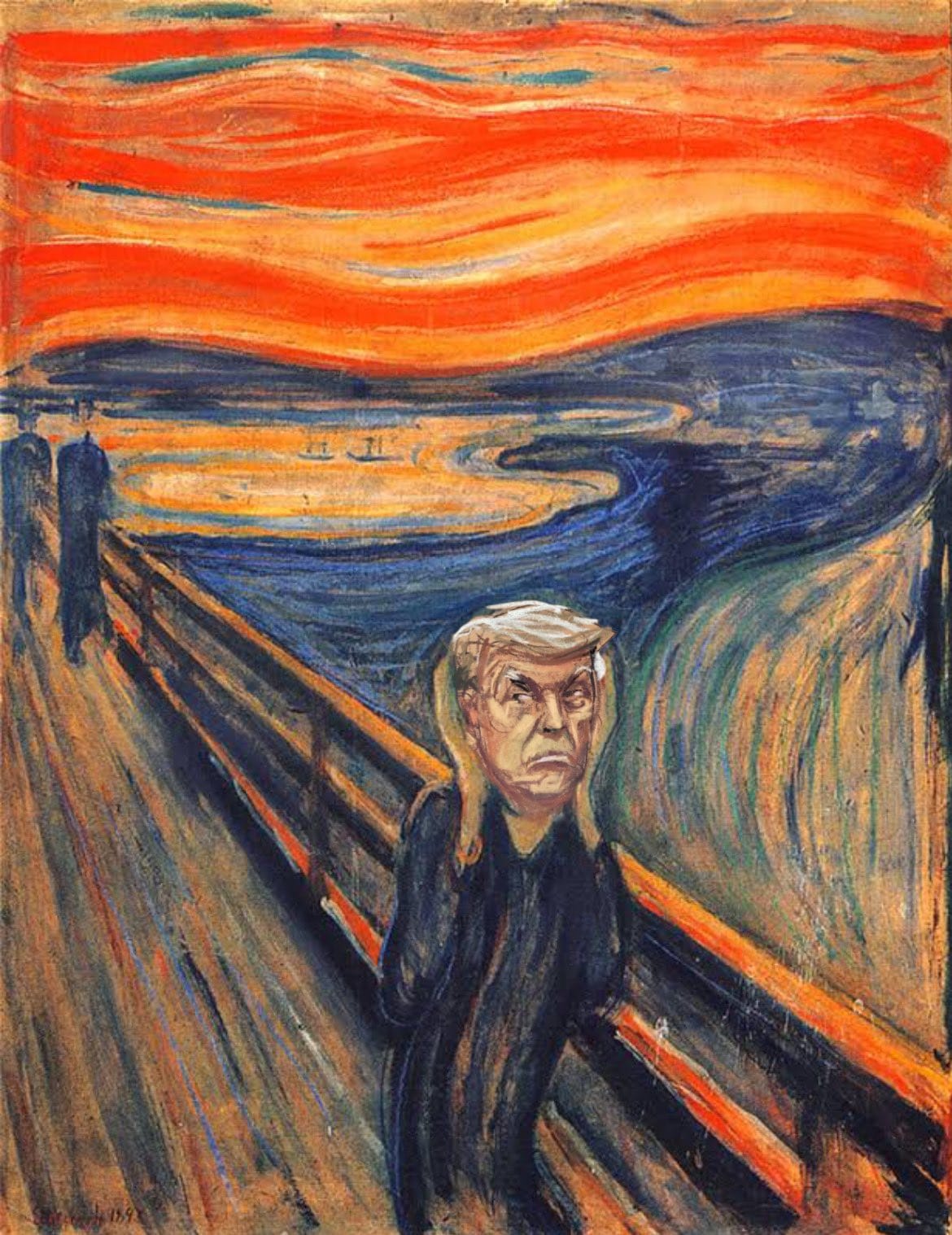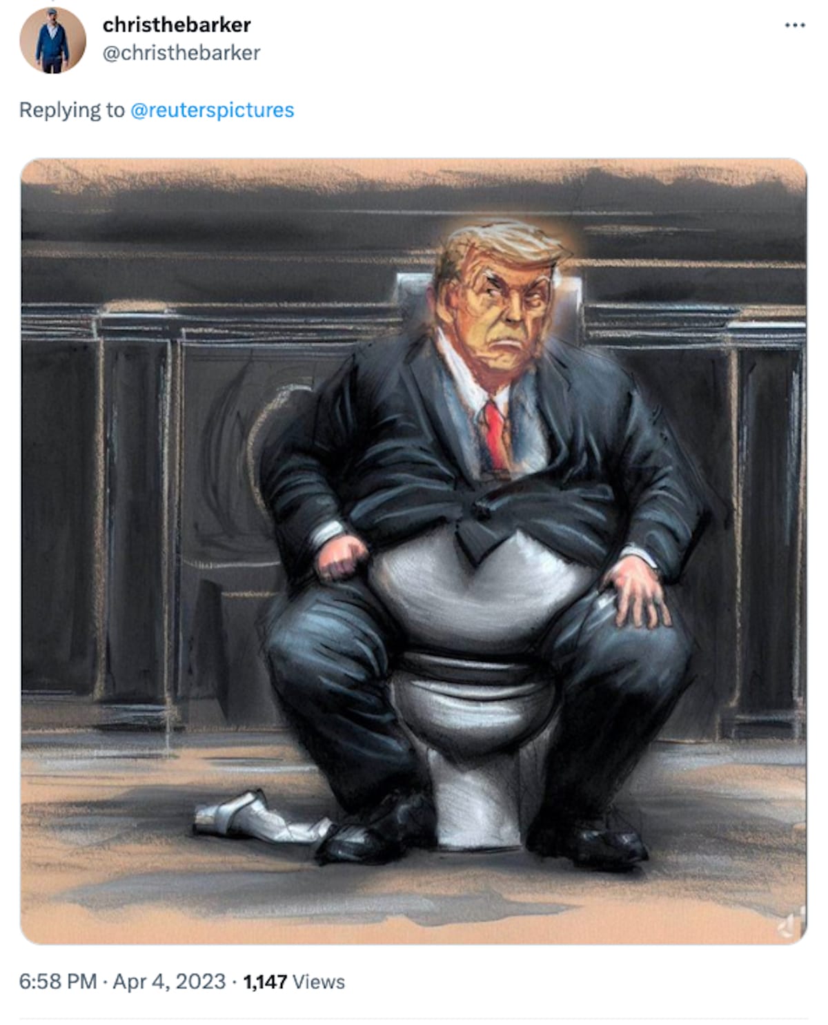Some pulled inspiration directly from portrait artist Jane Rosenberg’s fantastic courtroom sketch, placing the former president’s likeness in Edvard Munch’s “The Scream” (1893) or adding a bucket of fried chicken from KFC. One user Tweeted that Rosenberg’s sketch channeled the same energy as Siegfried Woldhek’s 2019 pen drawing of Trump, “Stable Genius." Meanwhile, London-based artist Chris Barker took the 2016 protest cry “Dump Trump” literally, showing America’s first indicted president on a toilet.