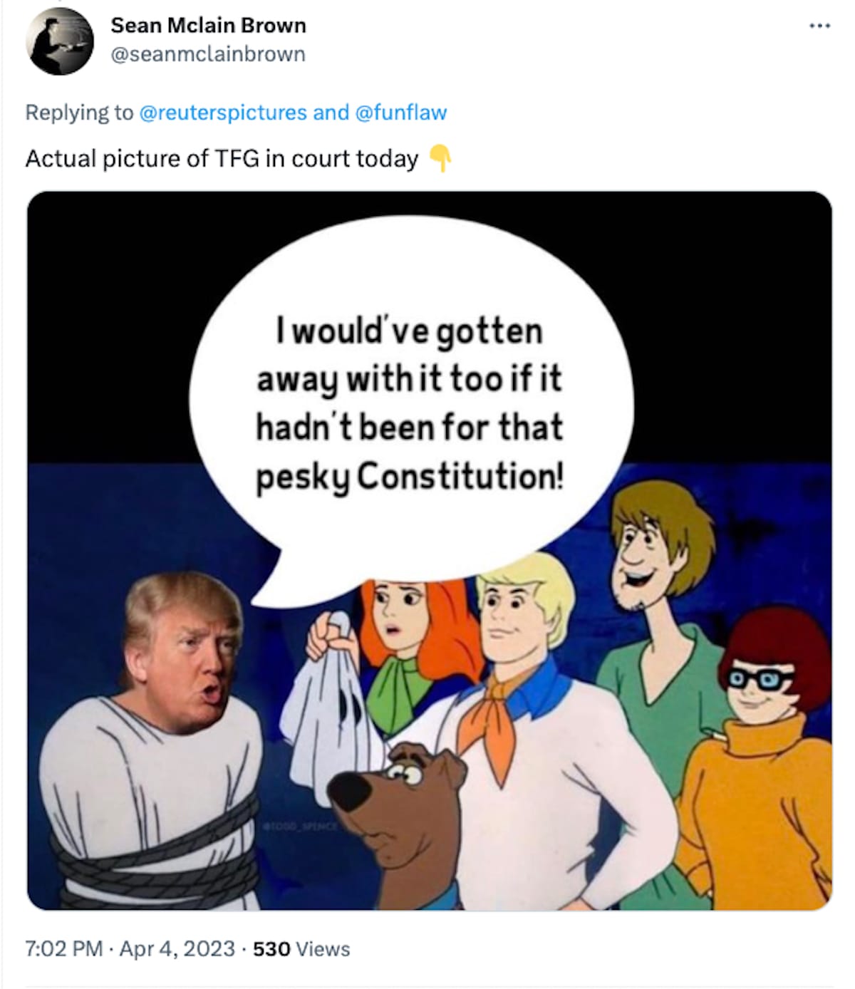 Journalist Sean Brown posted a meme placing Trump in an episode of the animated series Scooby Doo, Where Are You!. Here, Fred reveals the bound former president as the ghost haunting the last two presidential campaigns. (The jury is out on whether the president would have been the ghost clown, phantom virus, or the creeper.) A speech bubble plays on what is arguably the cartoon's most famous quote: "And I would have gotten away with it, too, if it weren't for you meddling kids!"