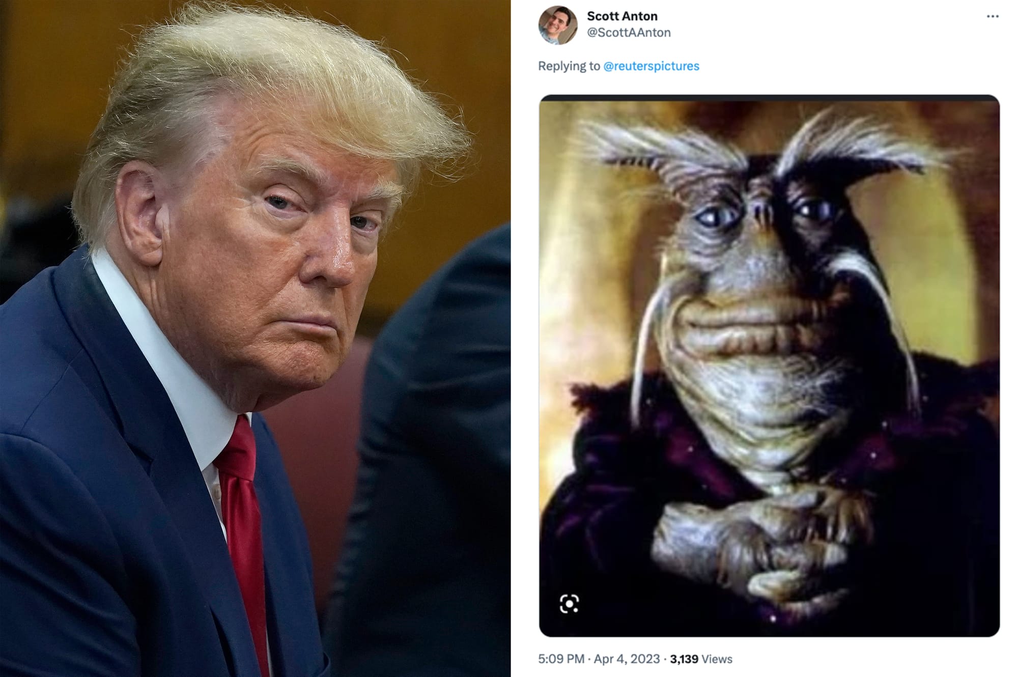 Only courtroom artists could capture the room and the former president’s expression for those 48 minutes. Despite limited source material to work with, Twitter users have still gone to town imagining their scenarios of Trump in the courtroom or a holding cell, mocking Trump’s expressions, and comparing his demeanor to figures from Dominar Rygel XVI, the deposed ruler from the early-aughts science fiction series Farscape, to Jim Carrey’s portrayal of the Grinch.