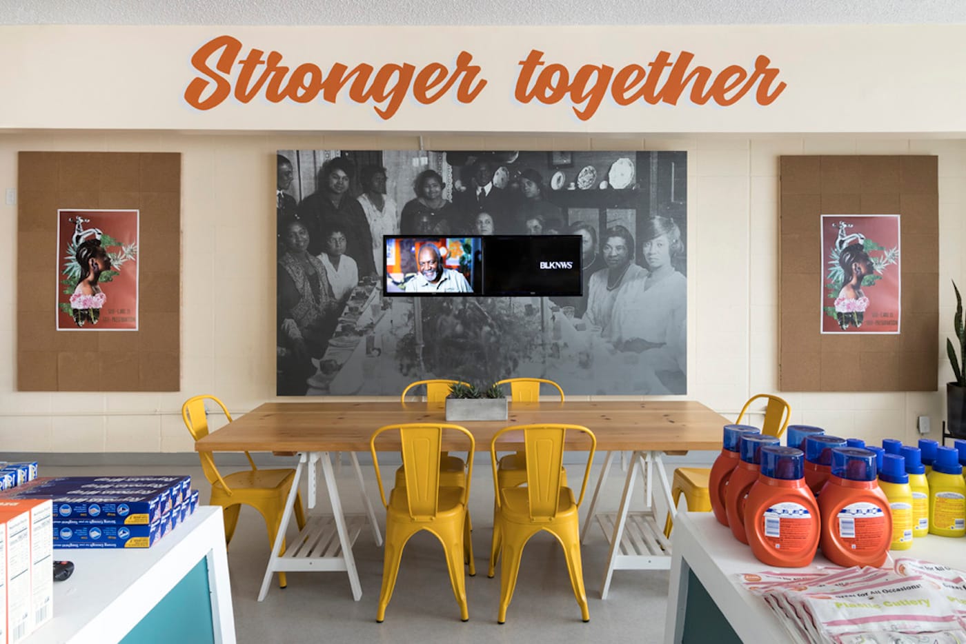 Khalil Joseph, "BLKNWS®" (2020-), installation view at Hank’s Mini Mart, a family-owned mini mart serving South Central LA since 1997, in the Hyde Park neighborhood (© Khalil Joseph; photo by Jeff McClane; courtesy the Los Angeles Nomadic Division)