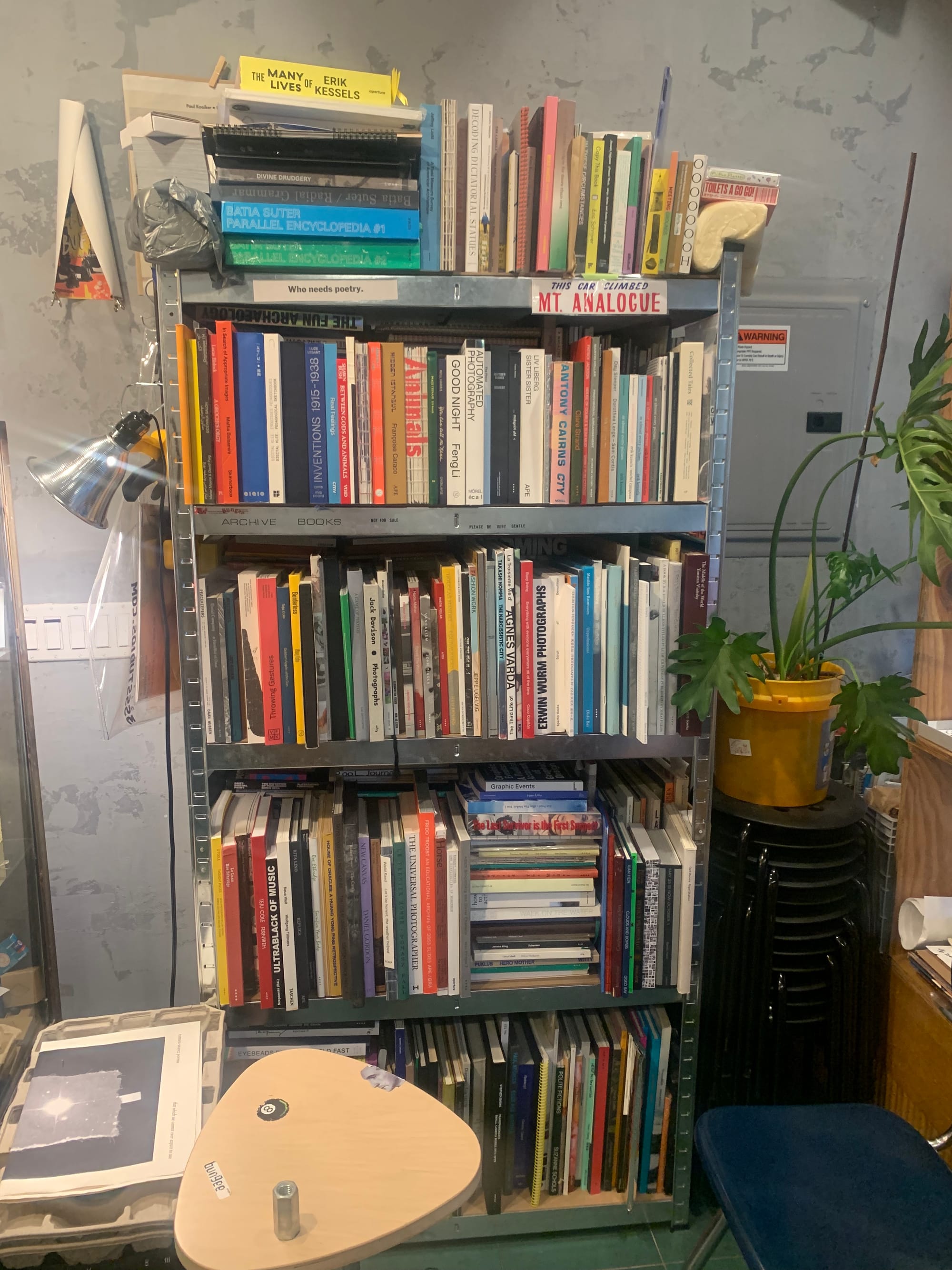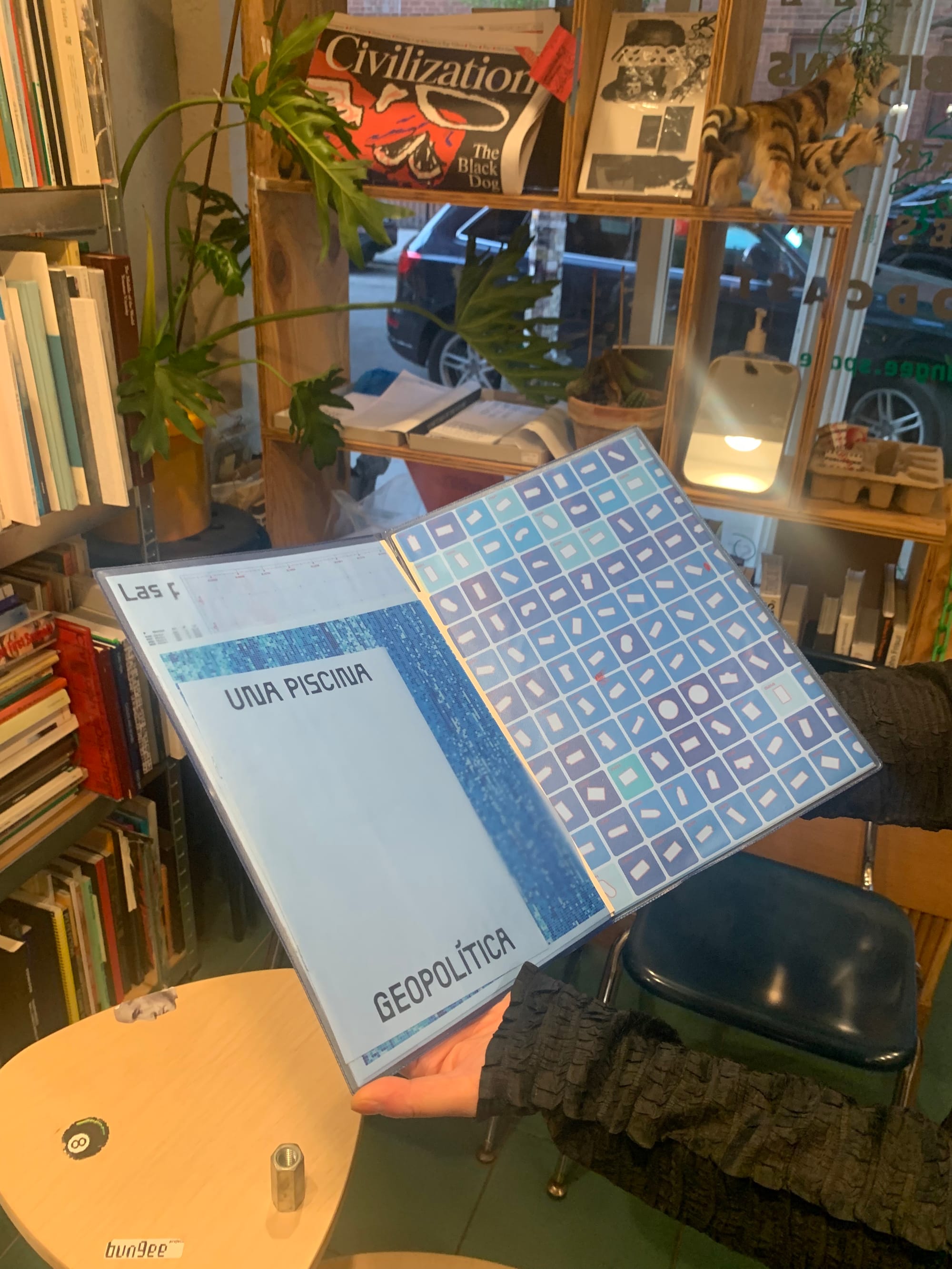 All of the carefully selected books are rooted in Huang’s keen interest in image studies as a portal into other topics. Four Times Through the Labyrinth (Spector Books, 2021) stands out as a longtime customer favorite, providing a deep dive into the labyrinth form through the transcripts from lectures given in 2013 in Leipzig, Germany — including but not limited to the discombobulating maze that is Ikea. Highlighted on Bungee Space’s small publication spotlight table during my visit was Revue Faire, running essays, how-tos, and experimental works related to graphic design on a biweekly basis during the academic year. Huang also recommended Una Piscina Geopolítica, which documents research and performance by artists Diego Abellán and Joaquín Lucas on the insidious abundance of swimming pools across Spain, given worsening water scarcity, for a thoughtful summer read. Though Bungee Space is currently out of copies, visitors can read this and other titles at the mini library corner, where a shelf and chairs make a home for visitors browsing sold-out titles.