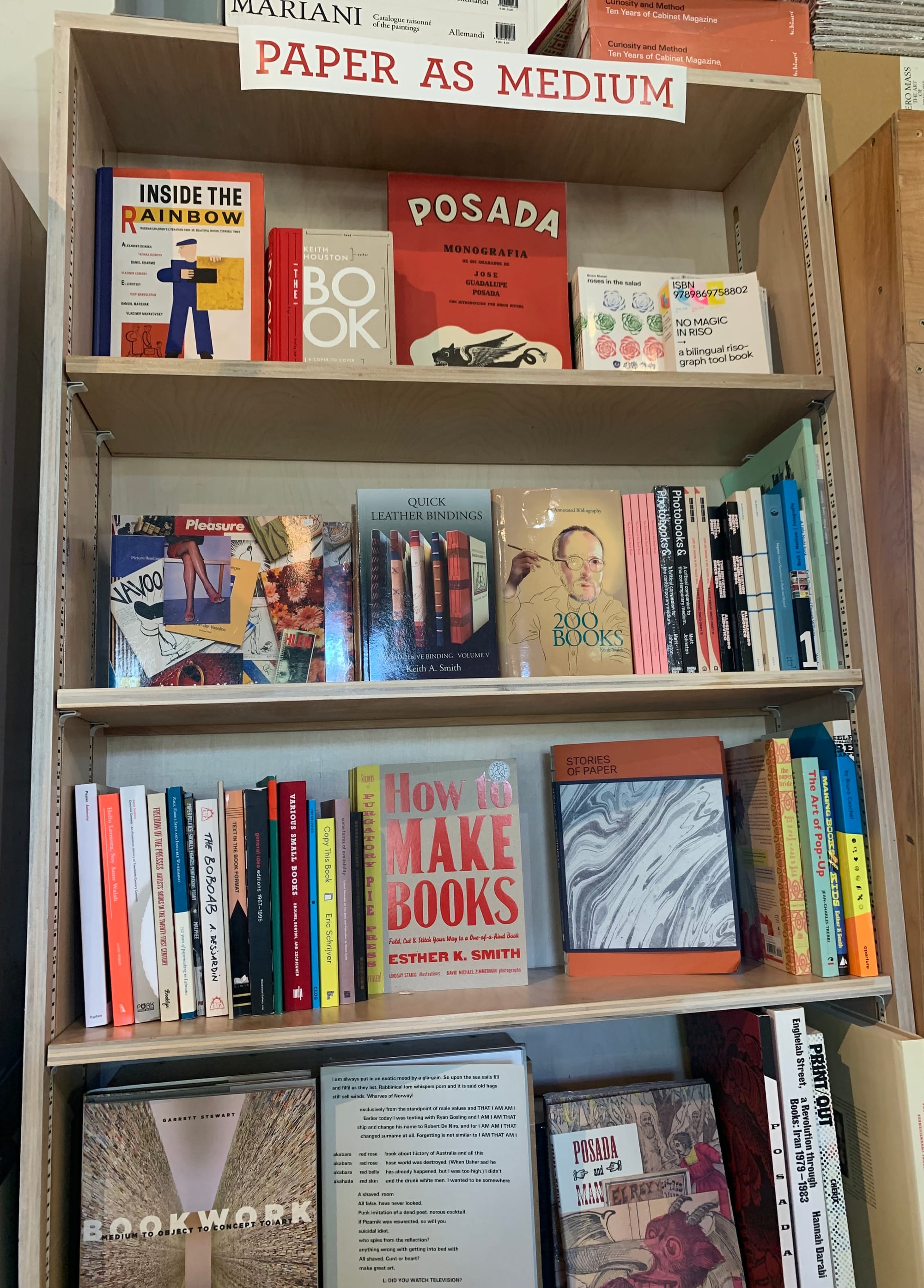 You’d never suspect that Artbook, sprawling across a former painting gallery in Queens’s MoMA PS1 museum, started out as a single cart parked in one of the museum’s hallways. The spacious collection of books of all kinds is now lined with shelves, tables, and bookstands custom designed and built by the staff to grant the space the adaptability required for art bookstores today. Shelves can be adjusted to fit larger books, which art publications often are, and tables on wheels whirl away to make space for launches and readings. Earlier this year, Artbook also began hosting independent publishers for month-long book residencies on one of their bookcases toward the entrance. May brought Duke University Press’s selections into the space, following Inventory Press in April and Ugly Duckling Presse in March. An independent store run by Distributed Art Publishers, Artbook contains a wide swath of titles to match its equally varied customer base. Bookstore Director Cheeyeon Park pointed out that many PS1-goers wander into the store while visiting the museum, so the team has intentionally built up an abundance of options, from a glass case housing out-of-print rare books to children’s titles to exhibition catalogues to a shelf entirely dedicated to that ubiquitous yet undersung medium, paper. Notably, rather than being tied to a museum ticket, entrance to the bookstore is always free.