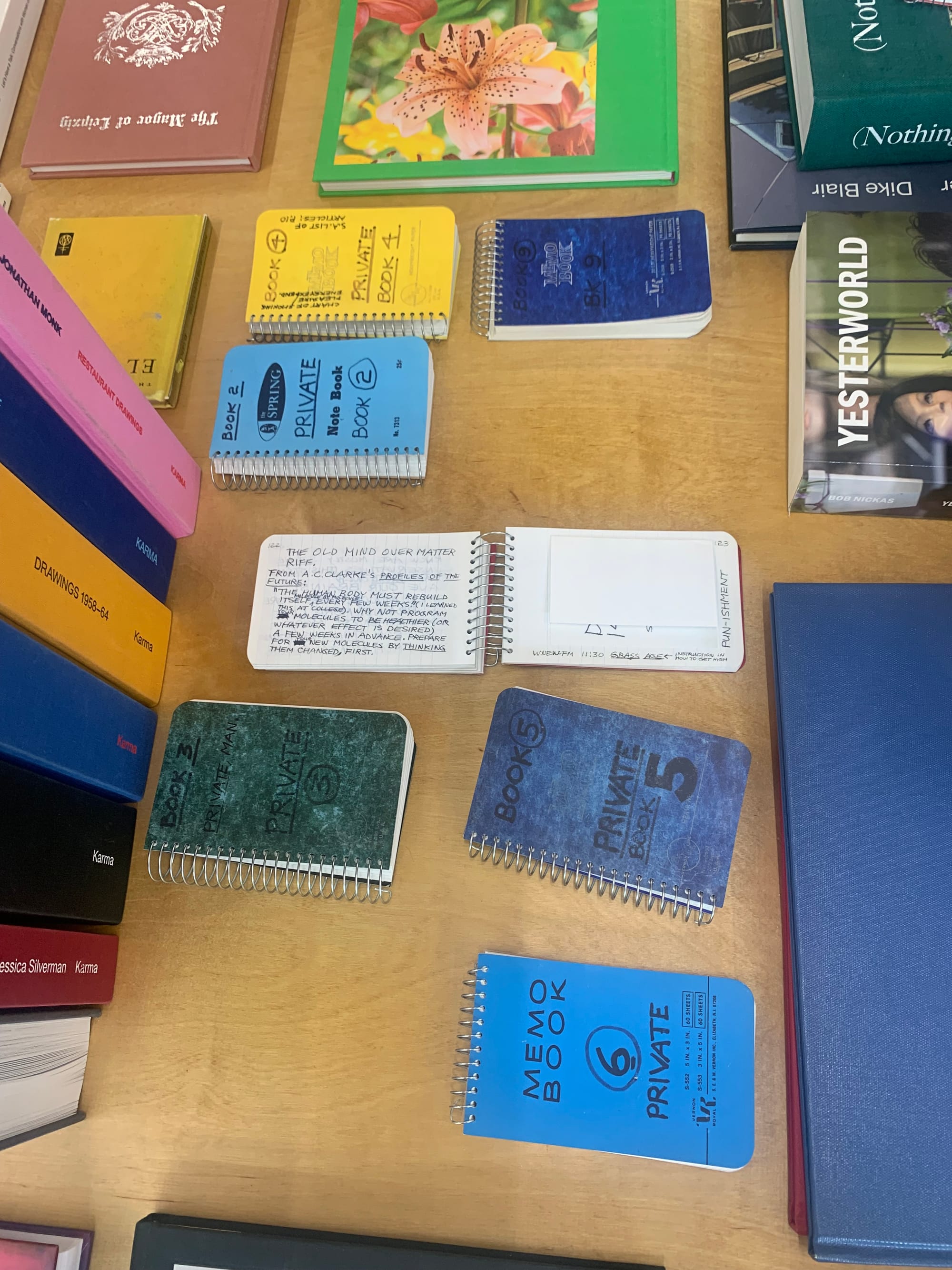 Shuster pointed out a few pocket reads for summer, like Hilton Als’s 2022 memoir My Pinup, which includes odes to pop icon Prince, musings on queer nightlife, and reflections on the AIDS epidemic. Karma’s charming series of artist facsimiles especially captured my imagination: One collection of exact reproductions of Lee Lozano’s lined memo notebooks appear as artifacts of the artist’s thoughts, replicating scribbled notes and plans in meticulous detail, down to ink blobs bleeding through the paper. The intimate collections are a touching way to bring the process of creation to life and honor the everyday artistic ephemera that might otherwise be regarded as disposable.
