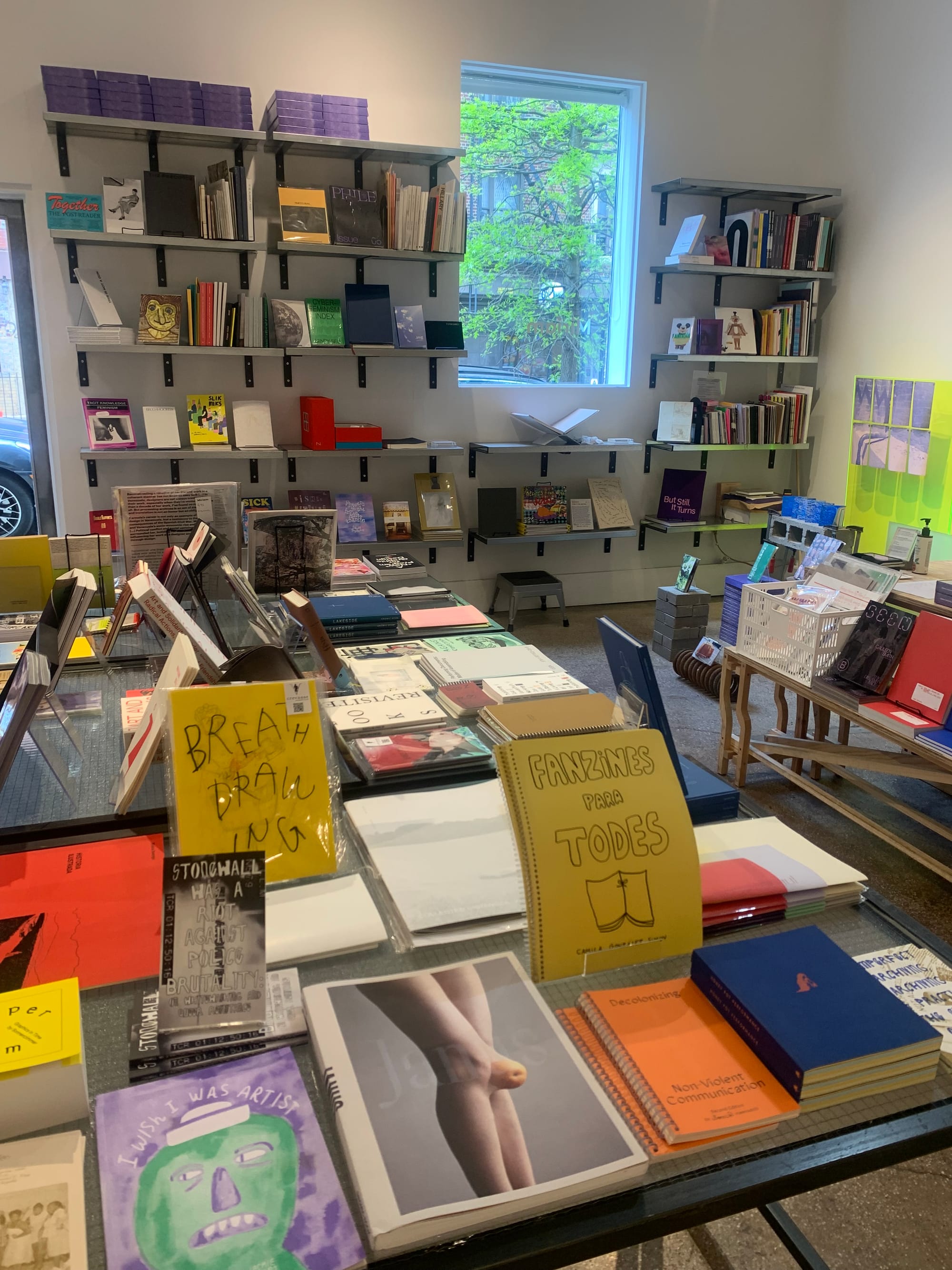 At Williamsburg’s Miriam Gallery, the boundary between artworks and books blurs in a welcoming two-room space, where founding duo Jaclyn Dooner and Simón Ramirez attentively curate exhibitions and book selections that palpably complement one another. They opened in 2019 with an express interest in interrogating the book as a form. Dooner said they rarely work with distributors and instead focus on stocking their store in direct collaboration with artists. “We actually had a hard time finding artists’ books,” she said. “When we first started, we saw a huge hole.” Now, they’ve built up a community of zinemakers, small publishers, artists, and collectives across the country, as well as internationally, with a growing selection of works in Spanish and Latin American artist books from presses like Calipso in Colombia and Gold Rain in Mexico.