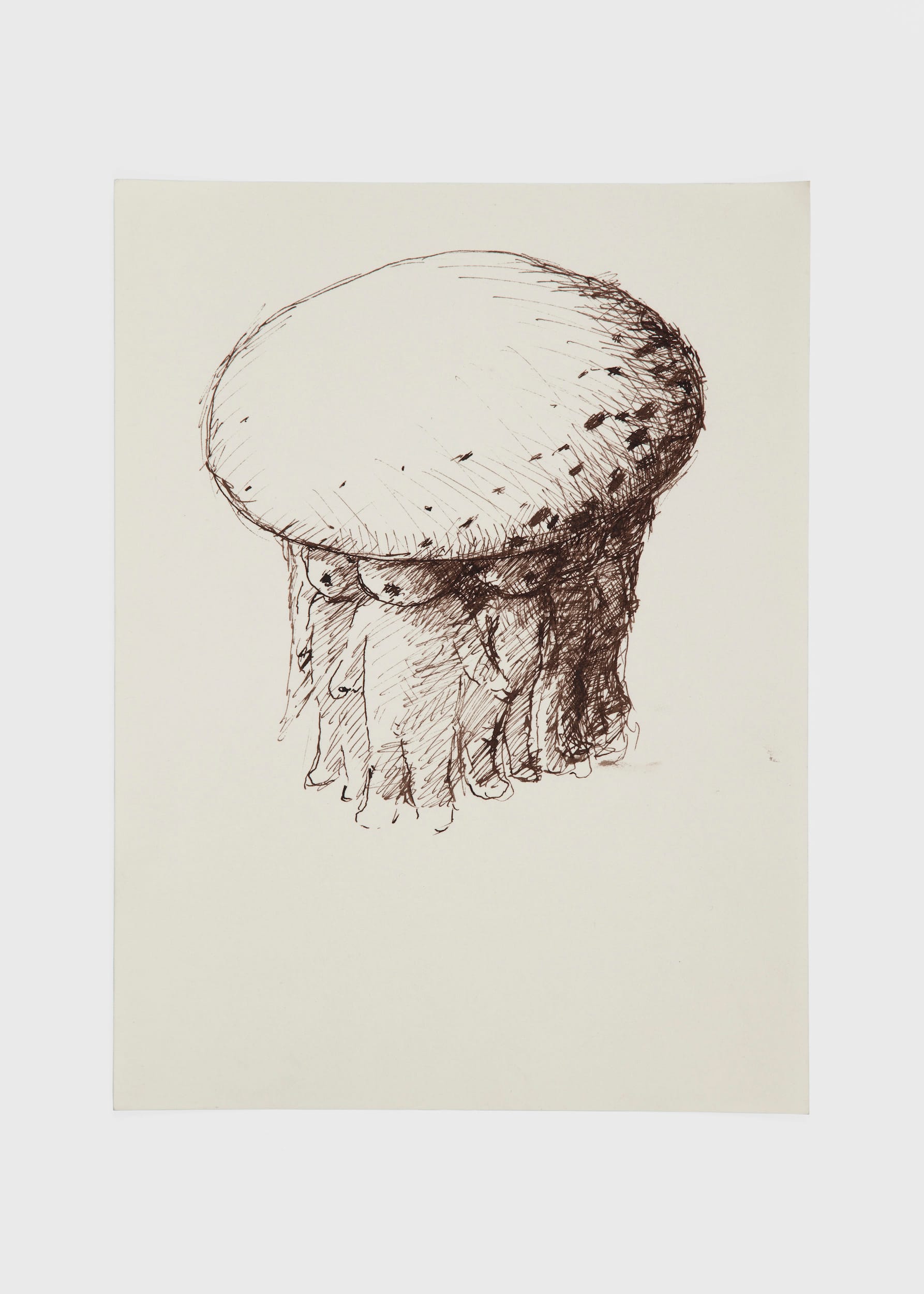 An untitled linear ink drawing from 2005 depicts an angled view of children’s stuffed bears crowded under a mushroom cap, which brought to mind Mayan mushroom sculptures and that civilization’s use of psychotropic drugs. By bringing together a hallucinogenic mushroom and childhood toy, often understood as both companion and alter ego, Yim suggests we might see her work as an altered state in which all kinds of memories and sights mix together to become something unexpected, unnamable, and not necessarily benign.